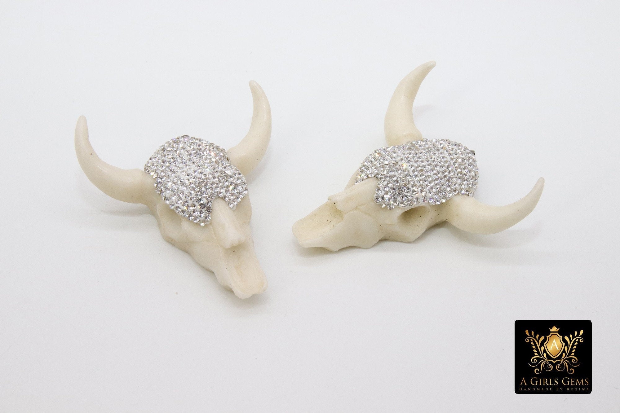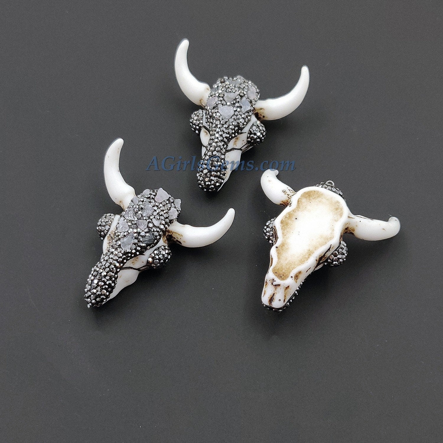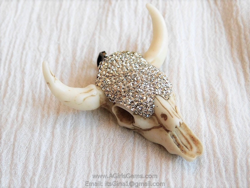 Special Notes: Handmade, artisan, 3-D or art form pendants can and may vary slightly from foil wrapping, texture, solder/electroplating process, colors or bubbles as seen in photos. They may also have slight recesses, holes, skips cubic zirconia or spaces, skips in gold trim tapes, pin pricks in molds due to processing and making pendants. No two pendants can compare or may be alike. The cow skull's eyes or other parts are glued in place and you can take them out. Regardless of how well we pack, the eyes may fall out and they can be glued back in. Also, the cows which are stained, you can lighten the dark color with a little acetone. You want to do so slowly so as to not take too much off. If you have any other questions, please don't hesitate to message us.