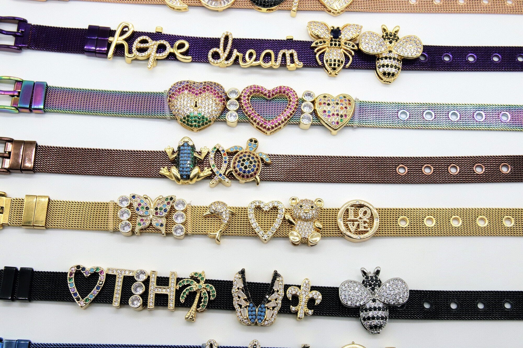 Bracelets: #1 Iridescent #2 Rose, #3 Brown, #4 Gold, #5 Black, #6 Purple, #7 Silver, #8 Blue