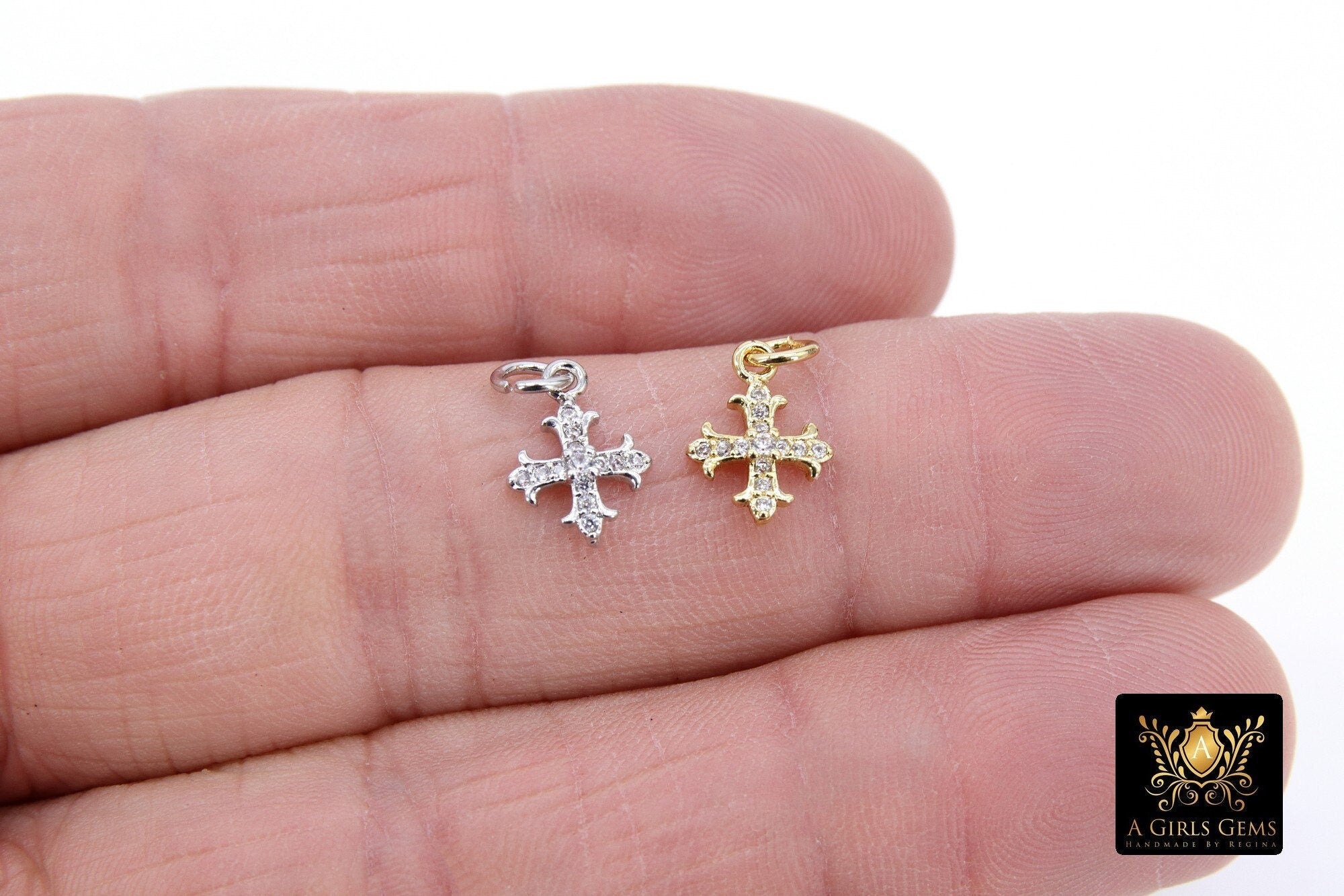 CZ Paved Gold Cross Charms, 9 x 12 mm Tiny Silver Cross Charm #3392, Minimalist Small Crosses