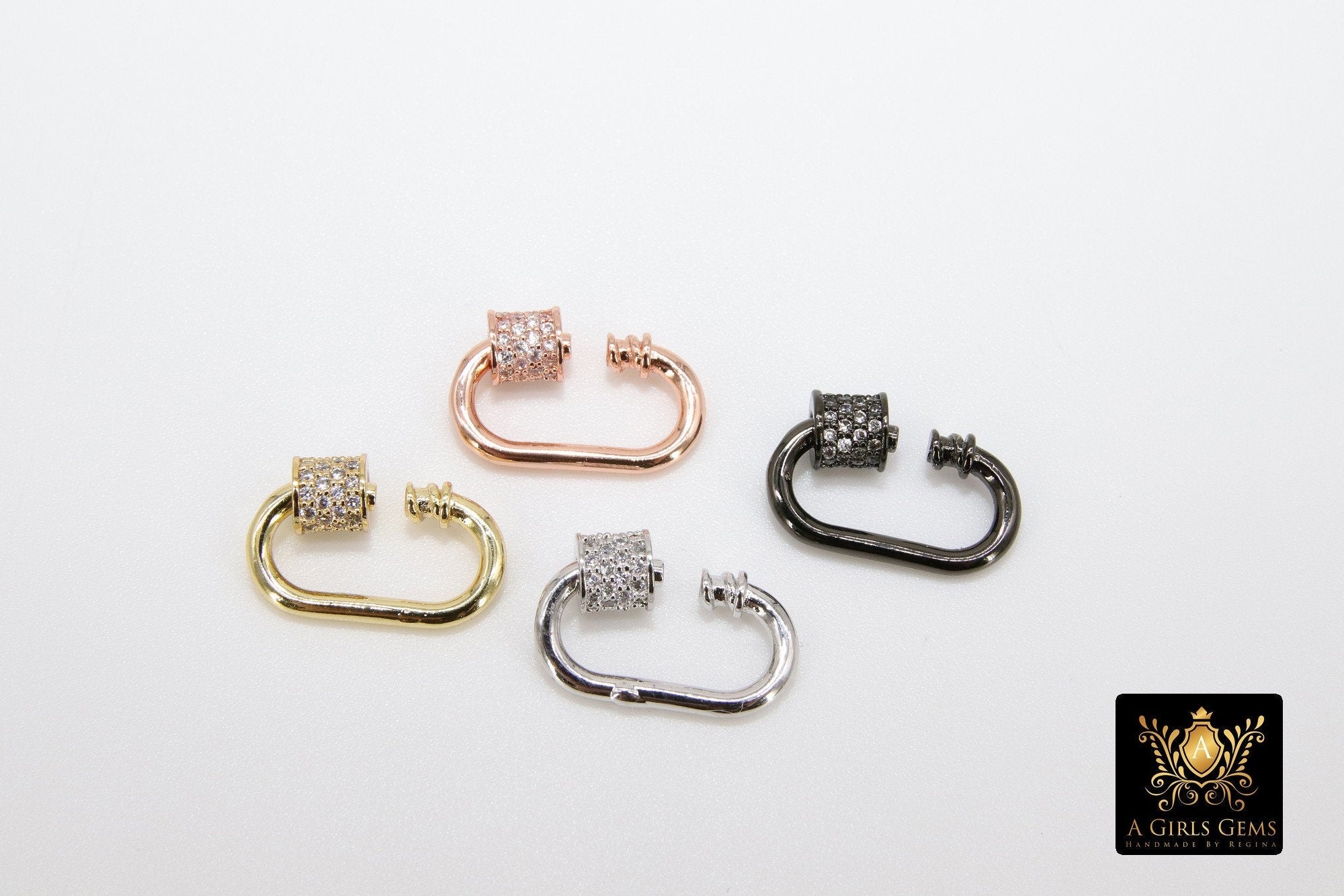 Gold Carabiner Screw Lock, CZ Oval Clasps in Silver Bracelet Findings #2302, Small