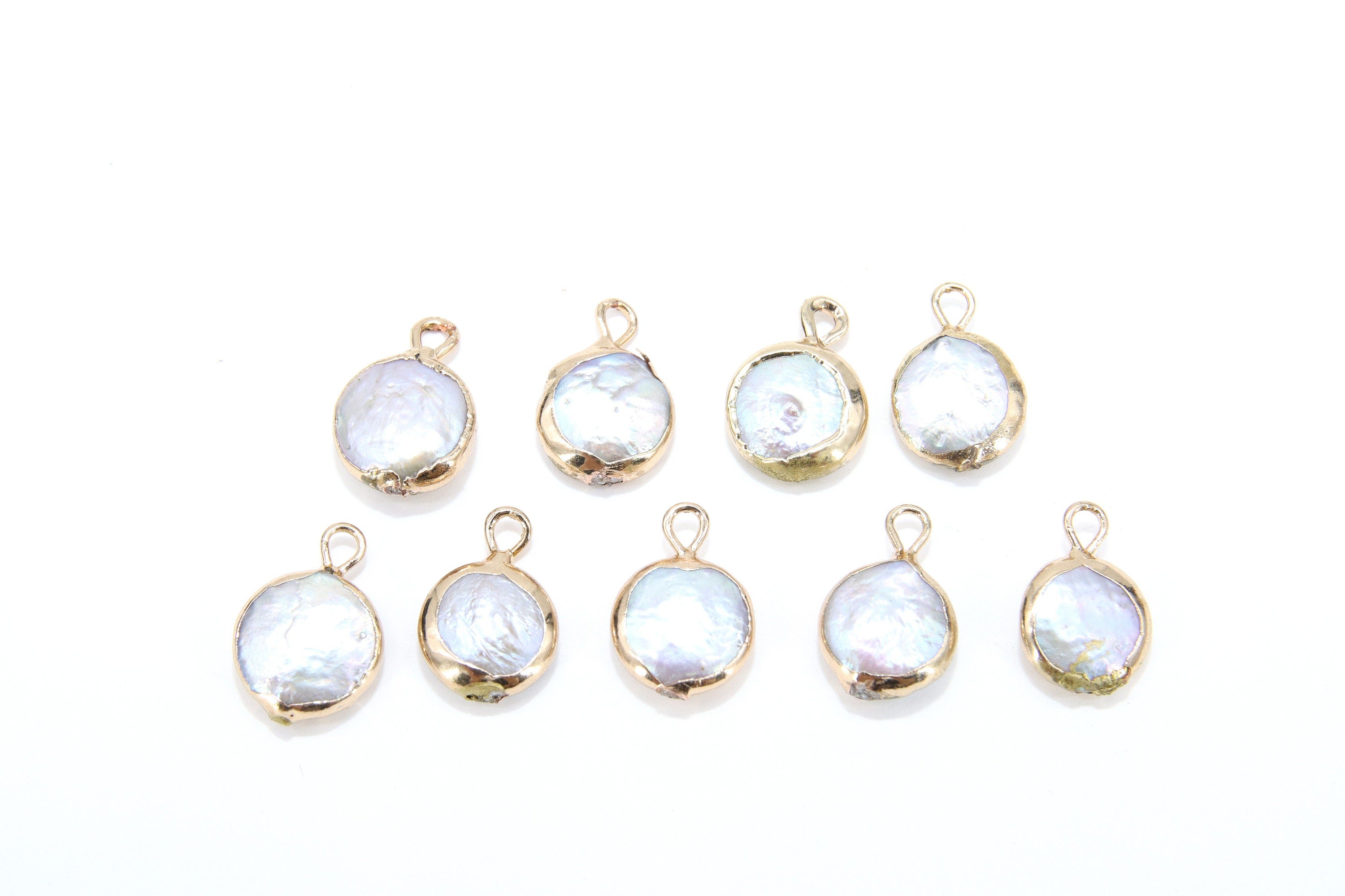 Freshwater Pearl Charms, Gold Round White Charms # 2650, 9 mm Natural Shell
