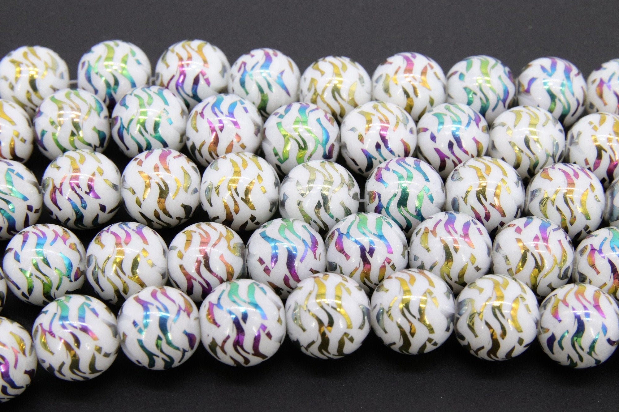 Gold and White Beads, Shimmery Smooth Purple Green Mardi Gras Tiger Stripe Rainbow Beads BS #46, sizes 10 mm 11 inch Strands