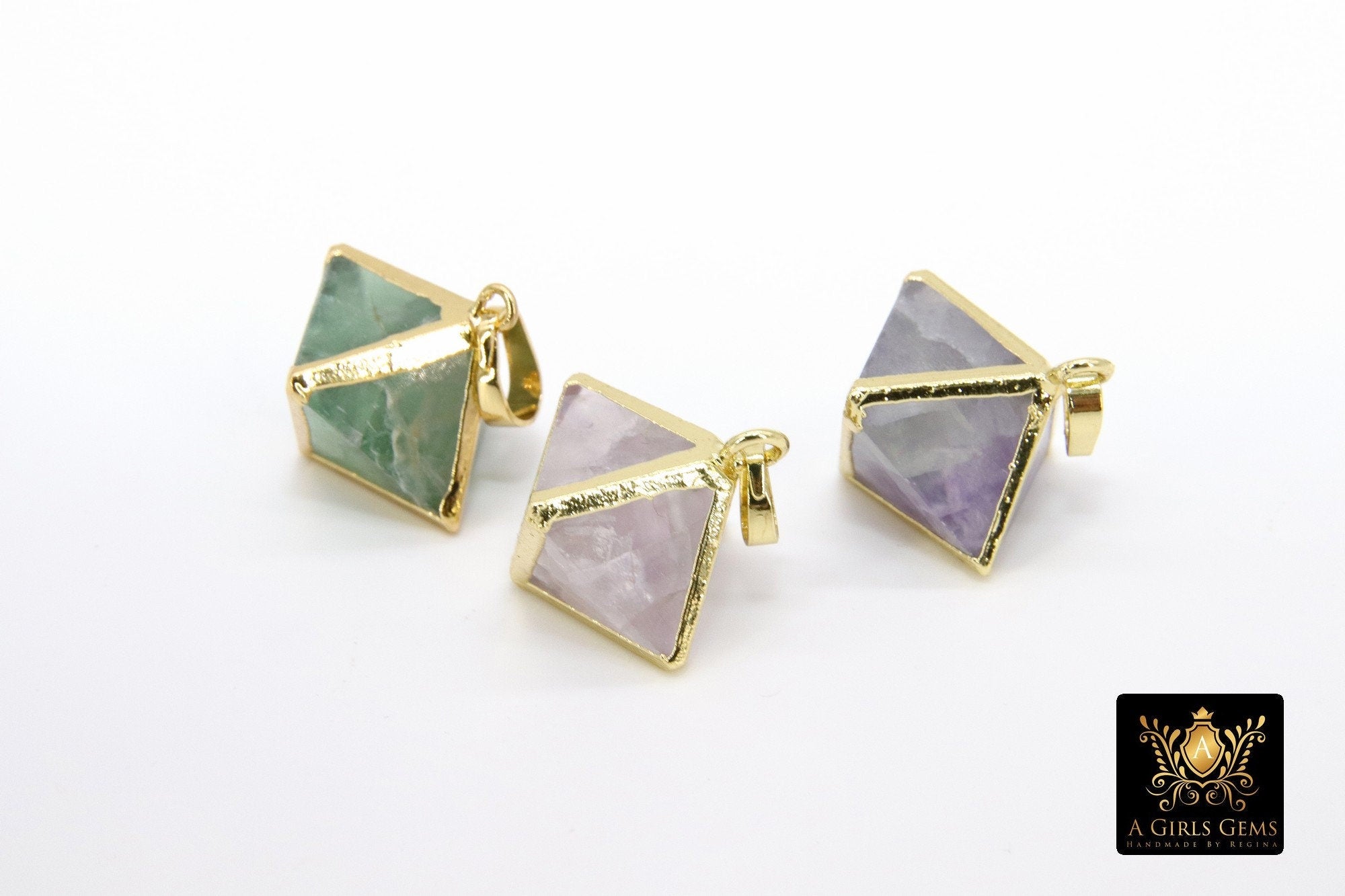 Natural Fluorite Diamond Charms, Gold Hexagon Shape Pendant AG# 2096, Purple Green Pink Clear Quartz Gemstones Small Charms
