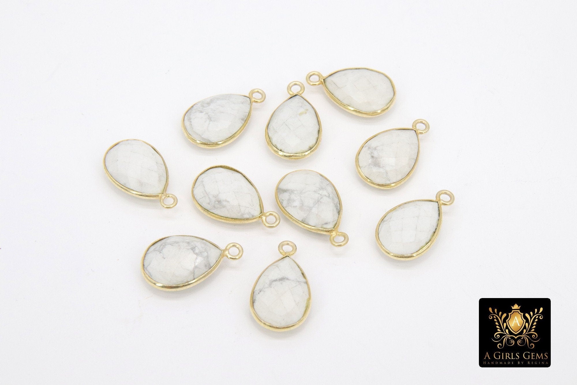 White Turquoise Teardrop Charms, Gold Plated Oval White Gemstones #2858, Sterling Silver Birthstone Pendants