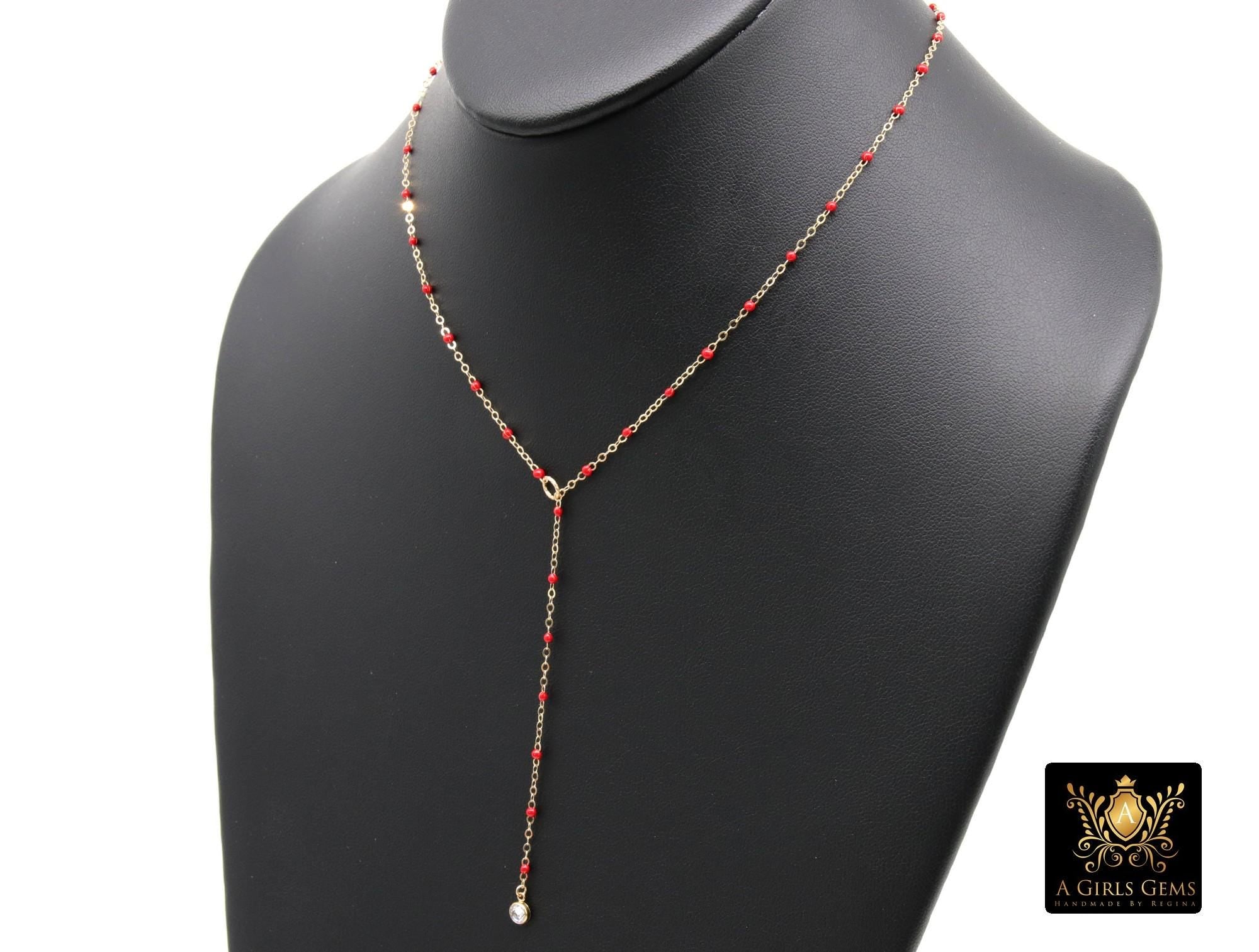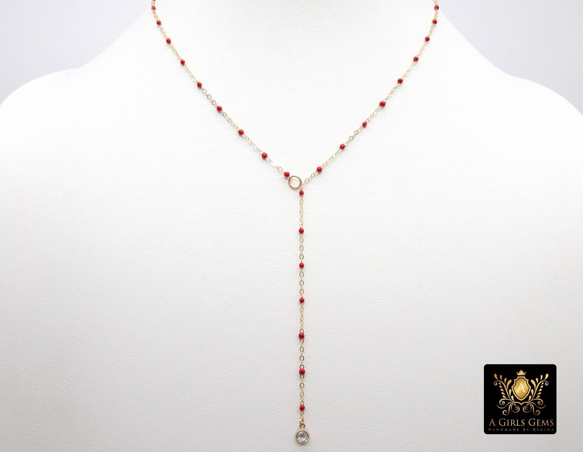 14 K Gold Filled Dainty Satellite Lariat Necklace, Dainty Enamel CZ Everyday Chain Choker #615, Beaded Enamel Chain Link Drop