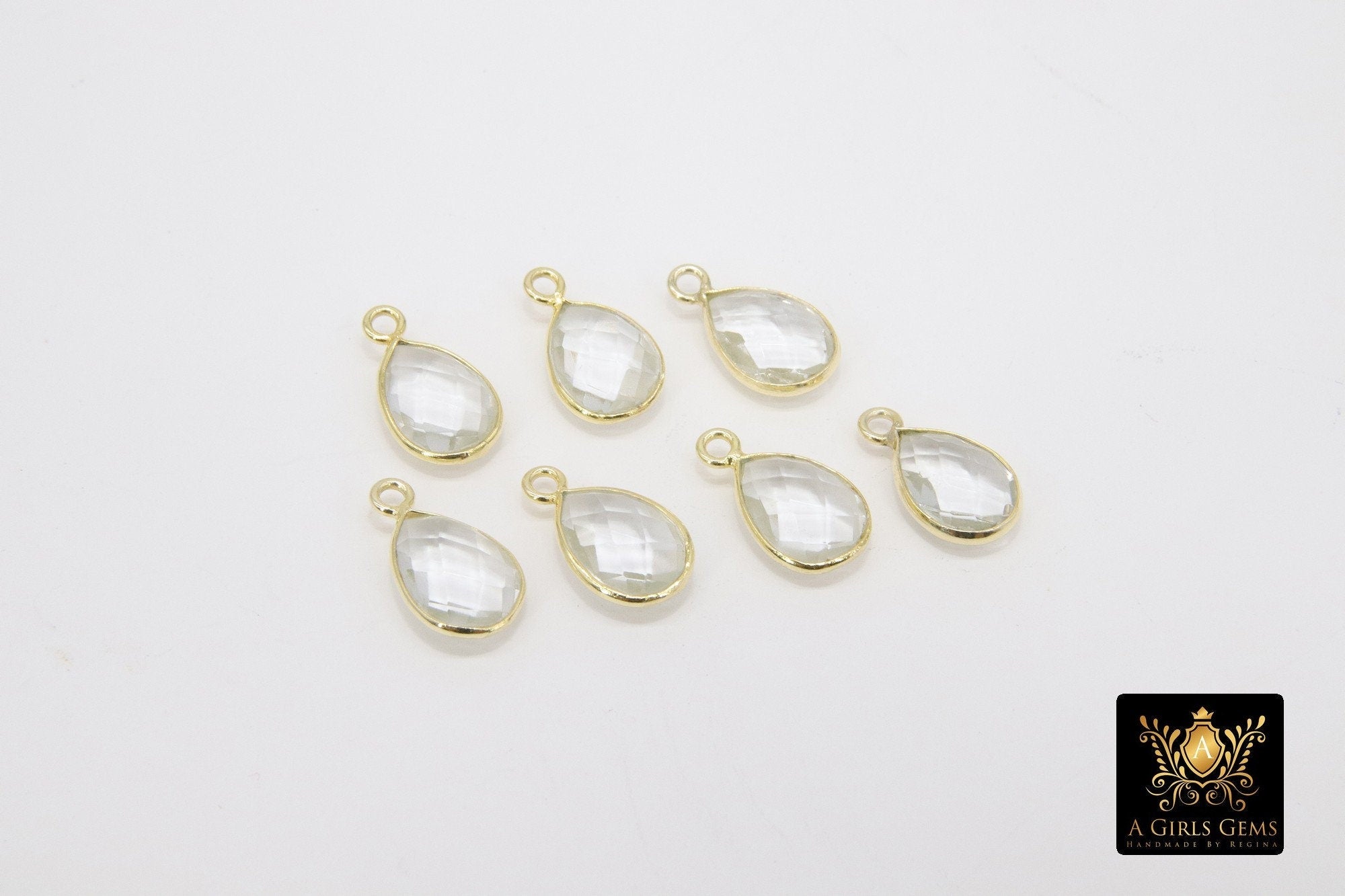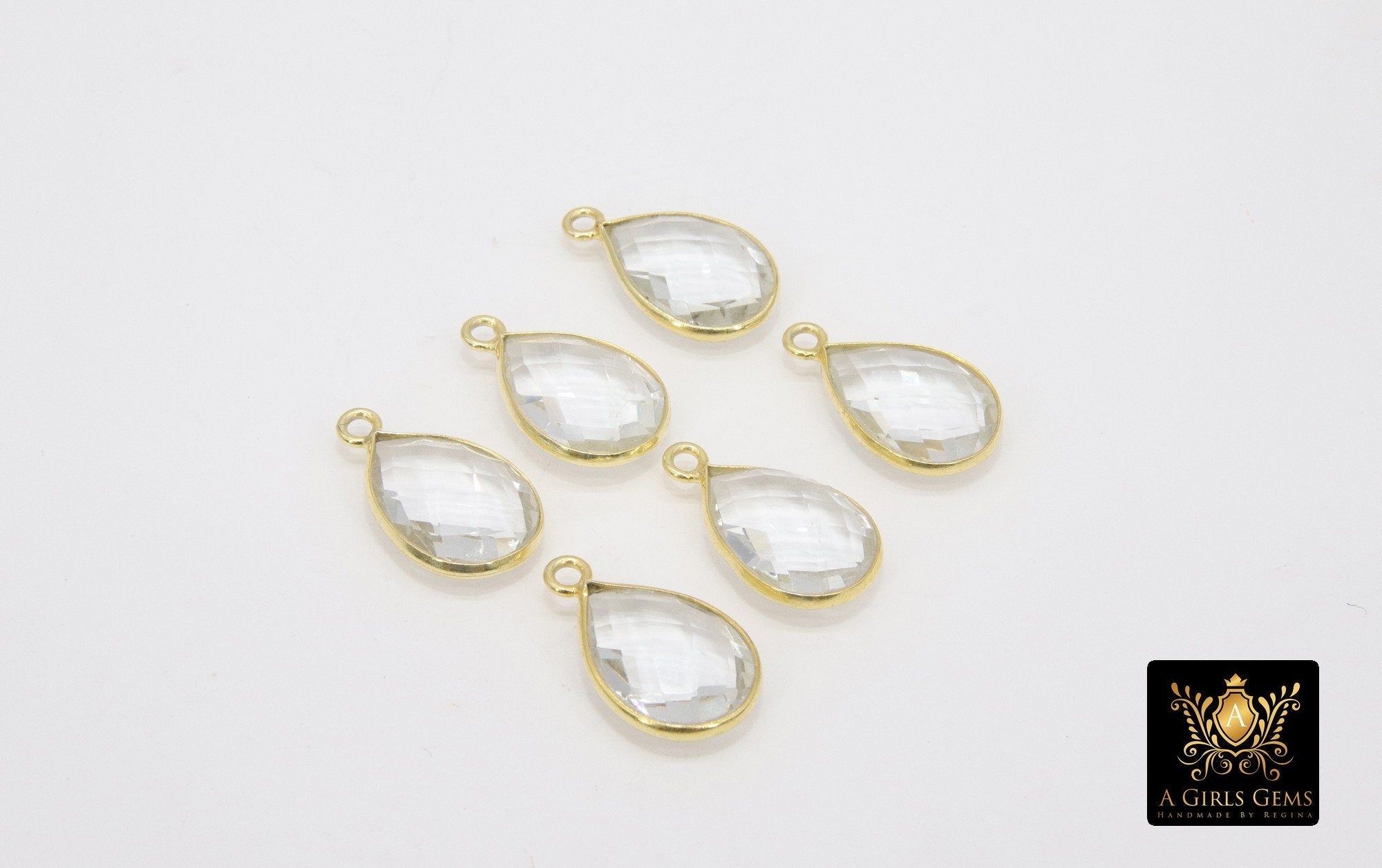 Crystal Quartz Teardrop Charms, Gold Plated Faceted Clear Gemstones #2859, Sterling Silver Birthstone Pendants
