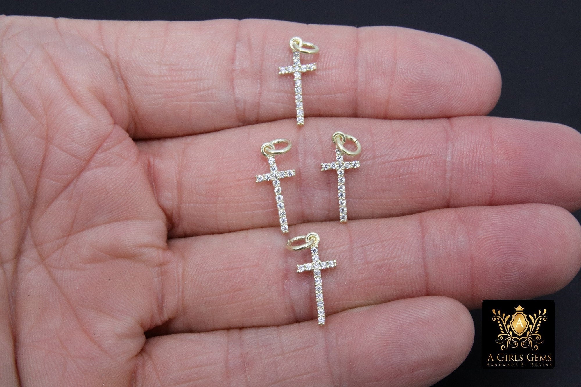 Gold CZ Cross Charms, Genuine Gold over 925 Sterling Silver Long Cross Charms # 214, Micro Pave Cubic Zirconia Cross Pendants