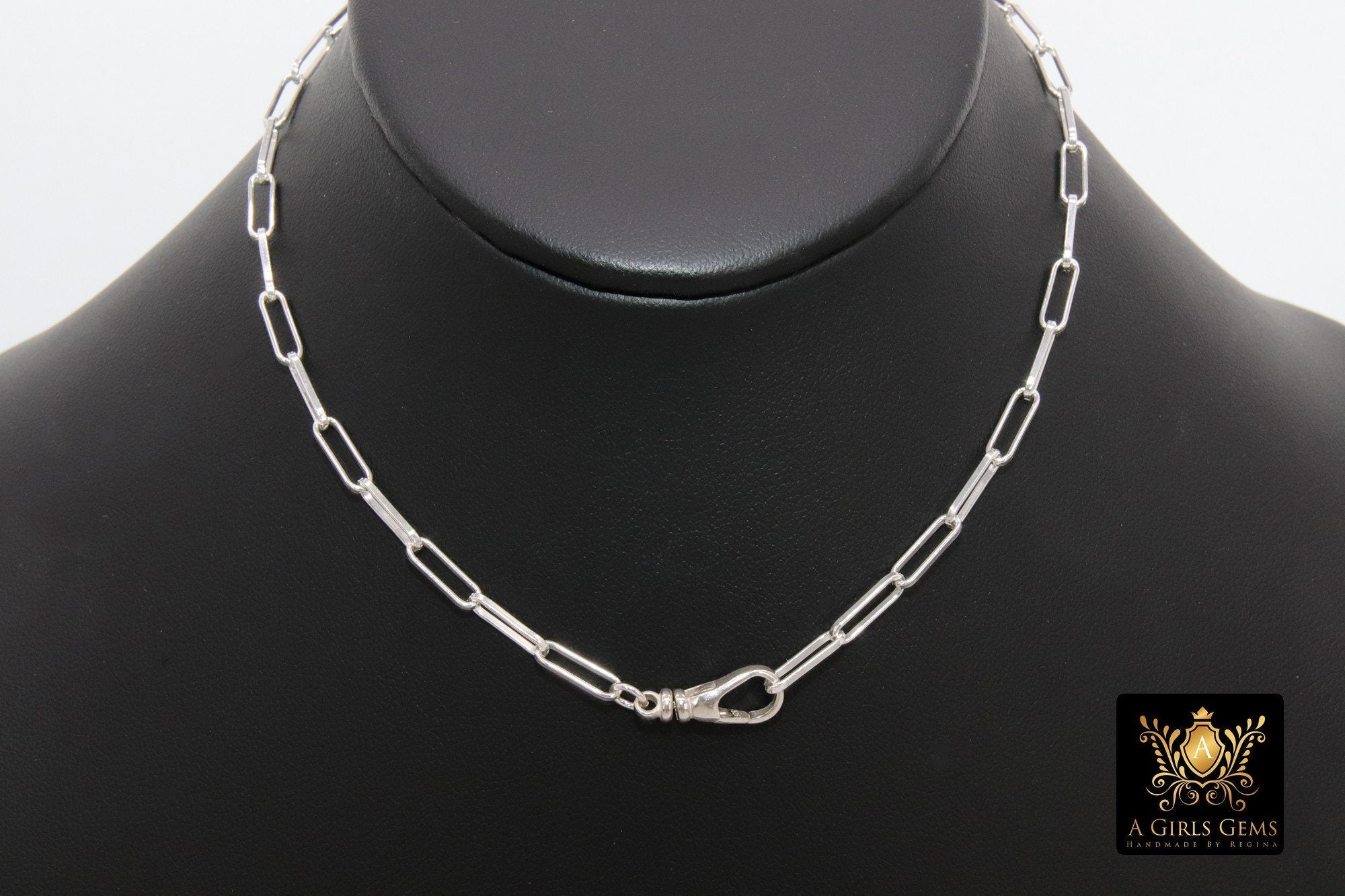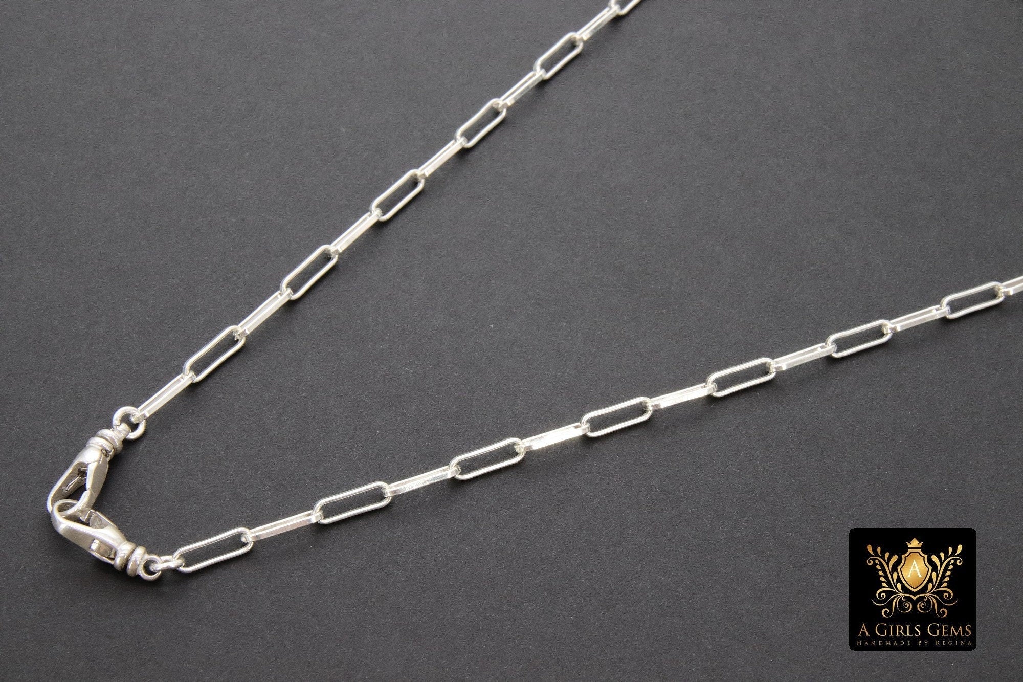 This necklace is on our Largest 925 Sterling Silver Designer Rectangle Chains, ***NOT plated *** will last a lifetime. Includes Two 925 Swivel Clasp in the front. This is a larger link chain and thicker gauge then typically seen in this style chain. This gives a bigger look to your necklace. You can wear your necklace fob clasps in the front or the back. You can also clip one of the Fobs on the link of the necklace to give another look. Our most popular lengths are below. If you need a different length, please message us with any questions.