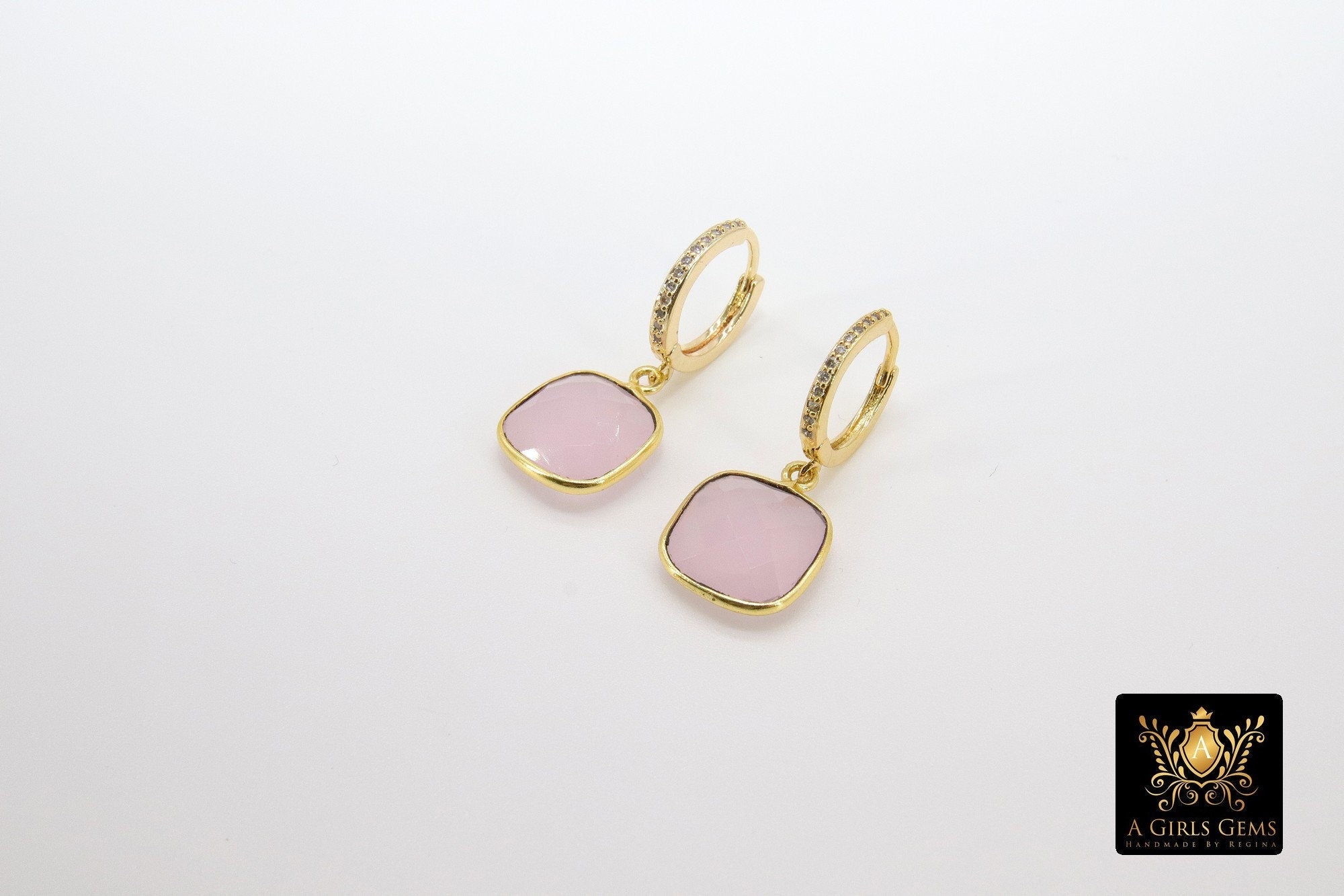 Huggie Hoop Earrings, Rose Quartz Gold Hoops, CZ Square Pink Gemstone Earring