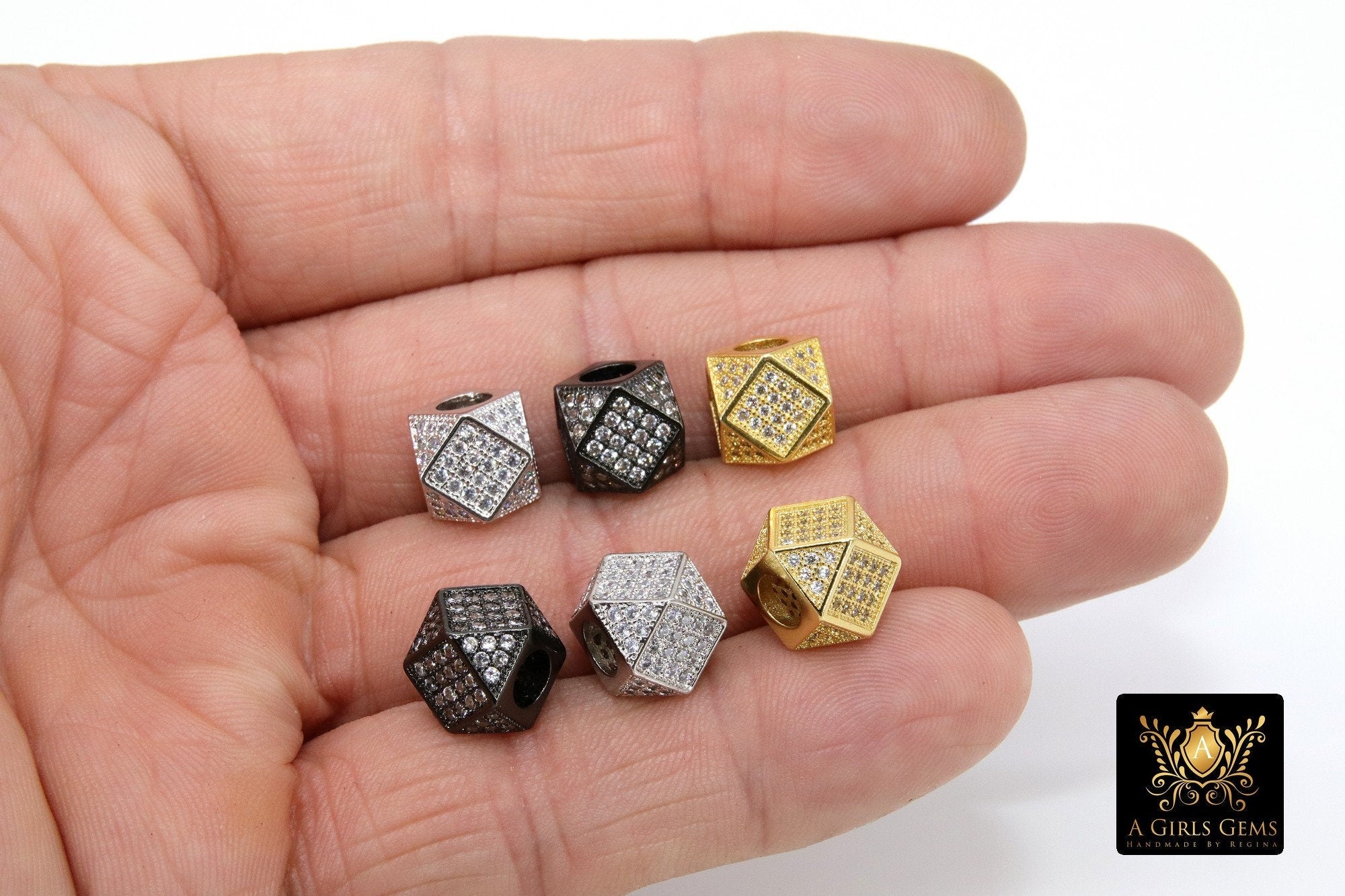 CZ Pave Cube Beads, Silver 10 mm Hexagon #215, Large Hole Black or Gold Square Spacer Beads