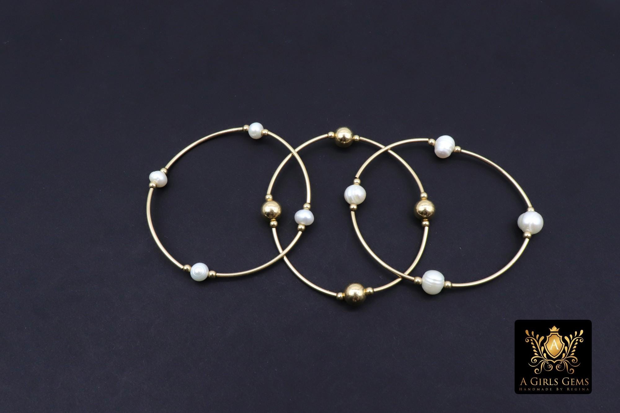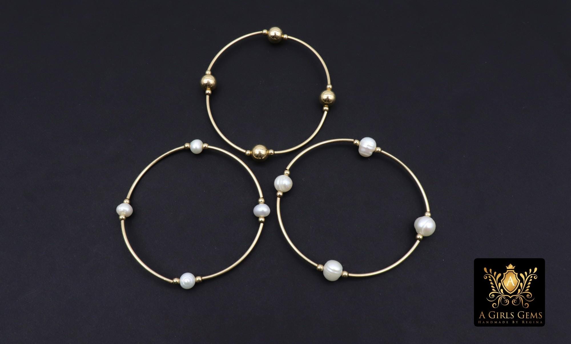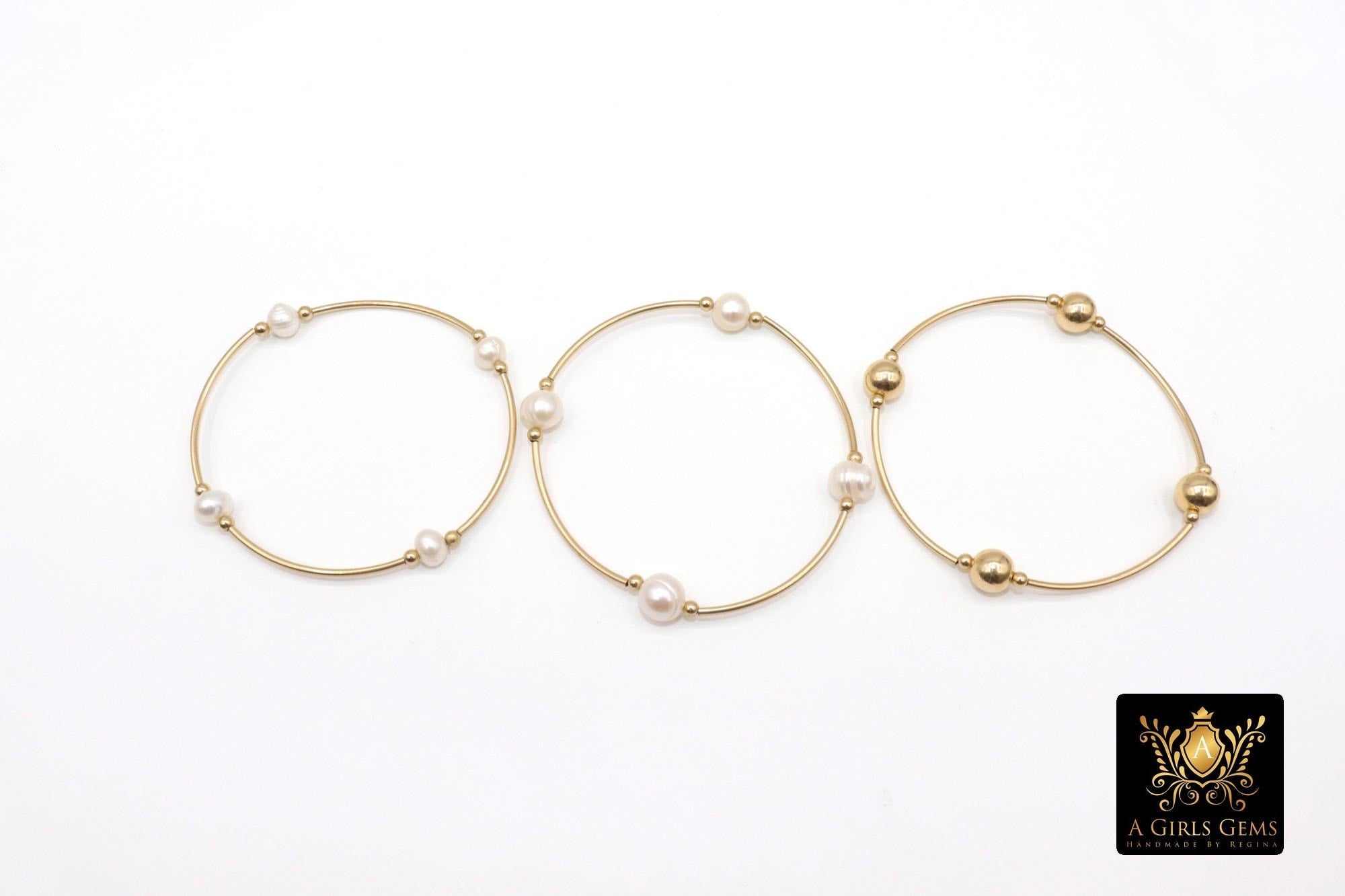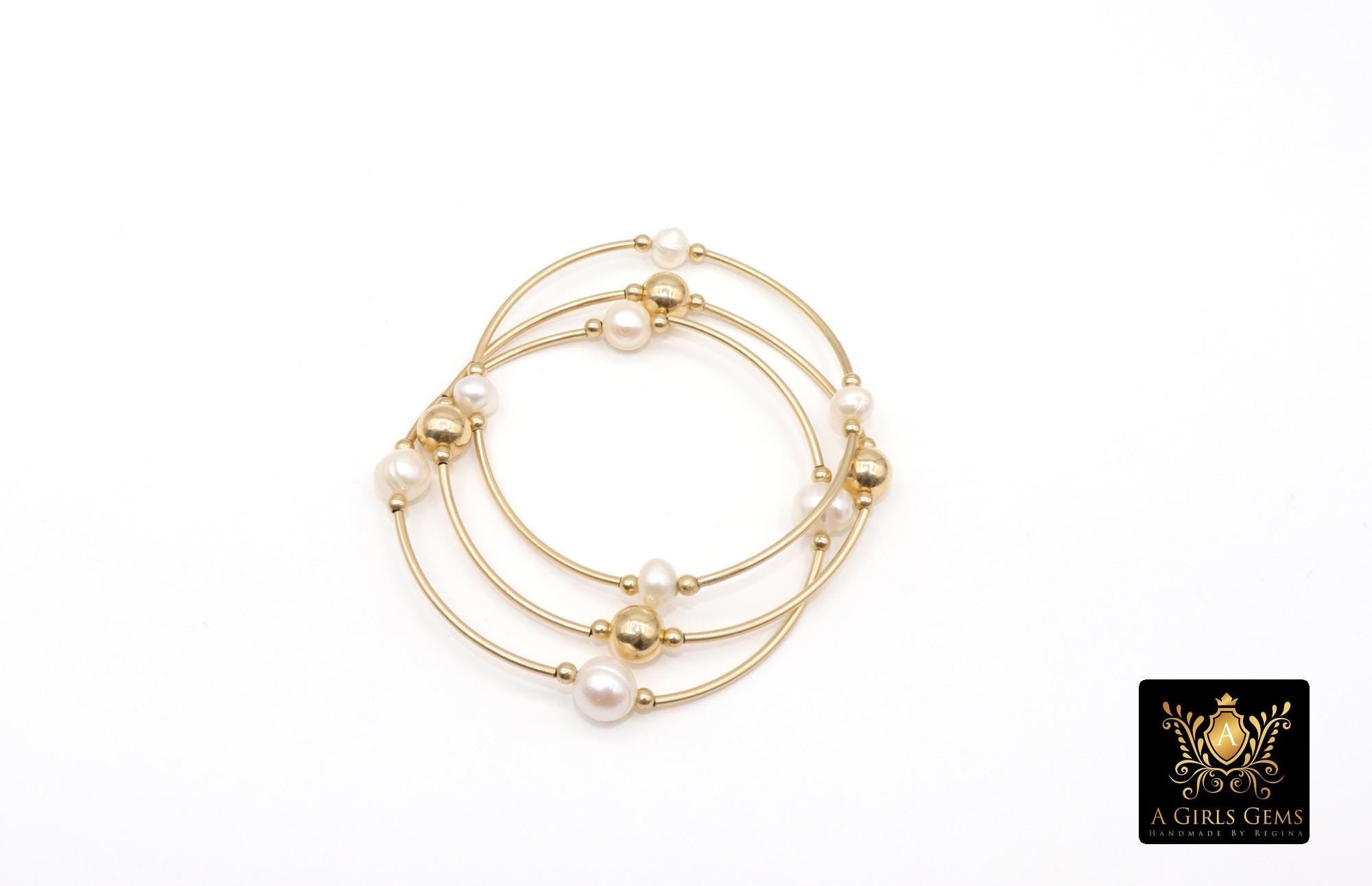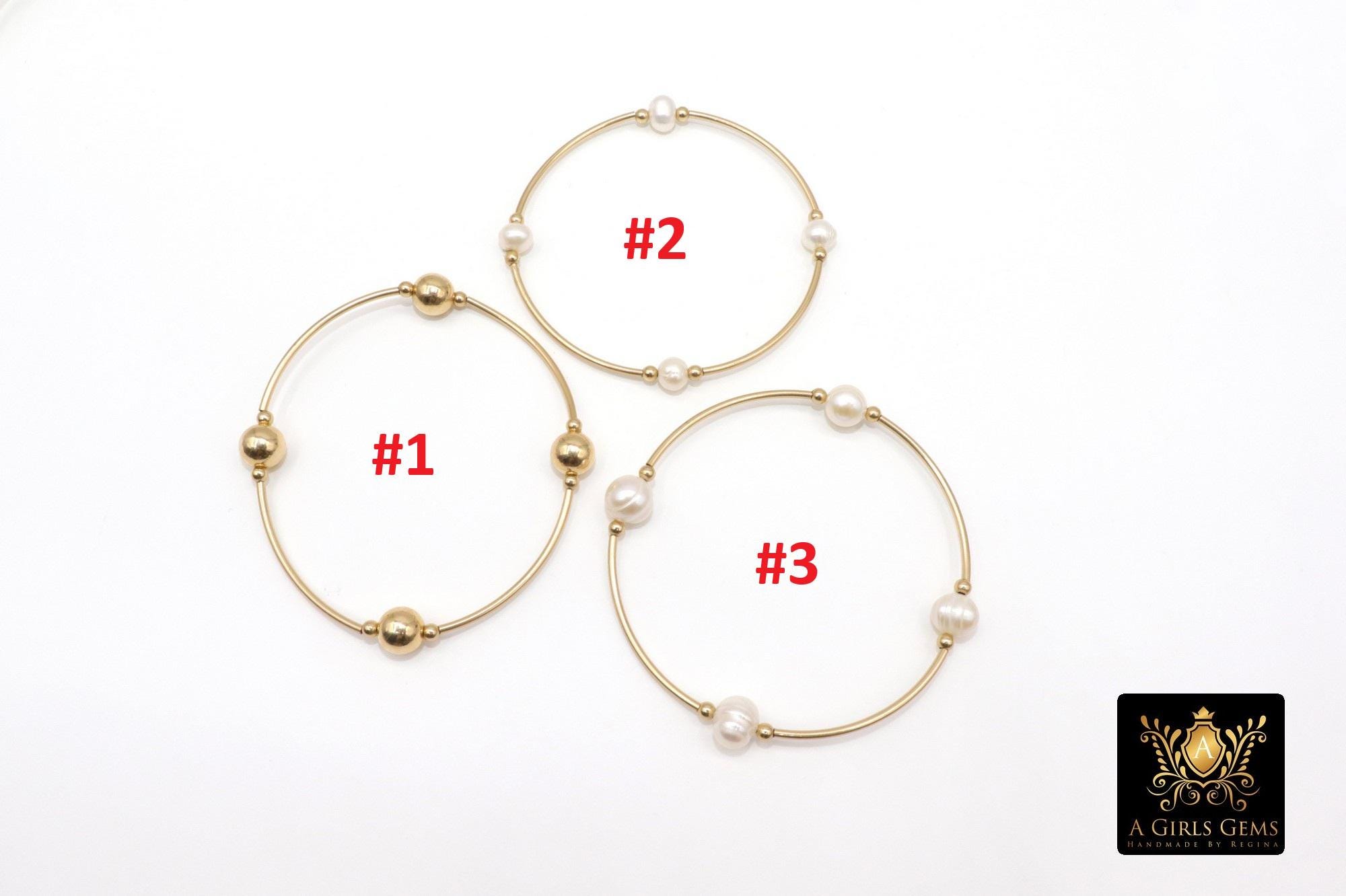 Genuine 14 K Gold Filled Stretchy Tube Beaded Bangle Bracelets, White Pearl Beaded Tube Bar Bracelet, Mom Gifts