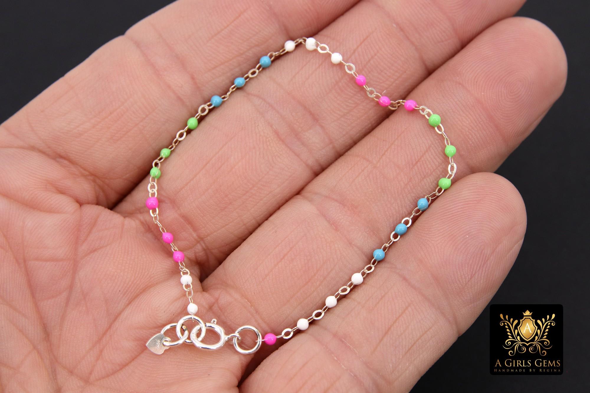 Genuine 925 Sterling Silver Dainty Beaded Satellite Chain Bracelets, Fuchsia Pink, Black, Baby Blue Turquoise, White, Orange, Multi Color, White Colors