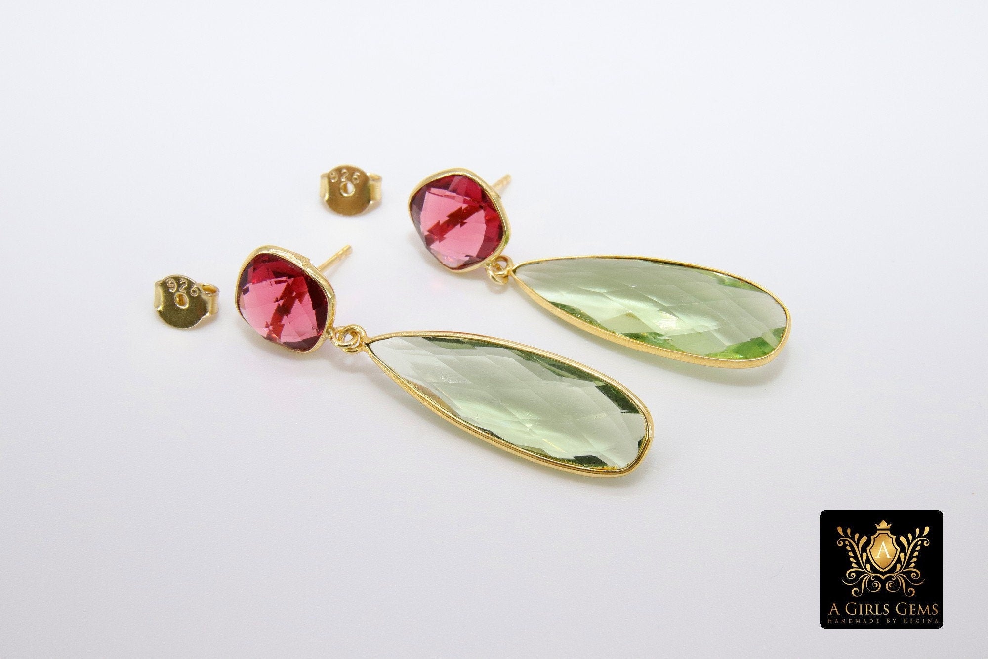 Green Amethyst and Pink Tourmaline Stud Earrings, Gold, 925 Teardrop Gemstone