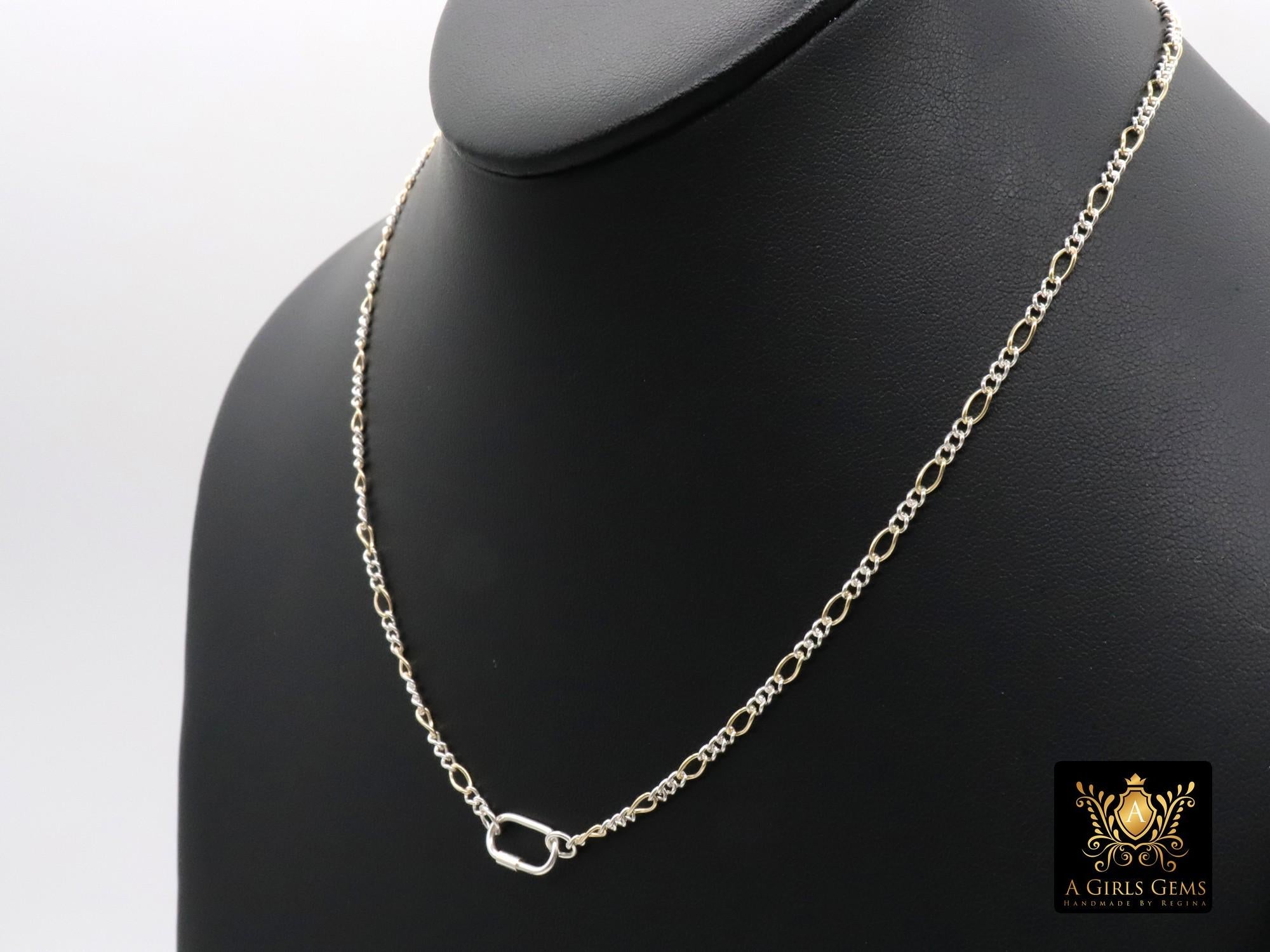 This necklace is on our Mixed Metal 925 Sterling Silver and 14 K Gold Filled Designer Figaro Chains as seen in picture 1, ***NOT plated *** will last a lifetime. Includes all 14 K Gold Filled components and 925 Sterling Silver which are waterproof. Our most popular lengths are below. If you need a different length, please message us with any questions.