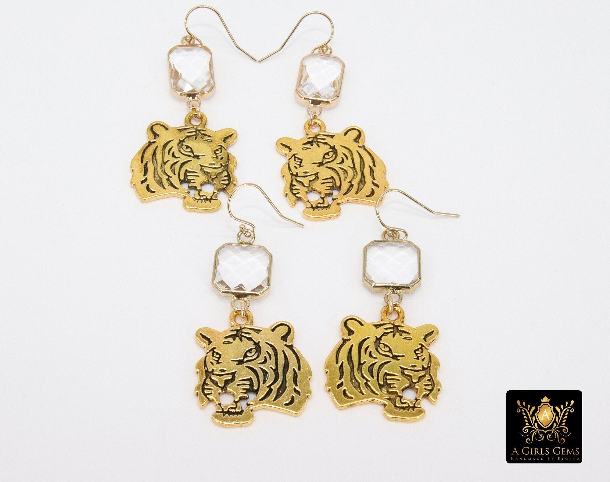 These earrings have Genuine 14 K Gold Filled Ball End Ear Wire Hooks for those who can't wear plated ear wires. Gold Filled ear wires are Hypo allergenic, lead free and nickel free. Choice of ear wires with only a tiger for short earrings or you can pick a square or rectangle plated faceted bezel Connector with the golden tiger head. Message us if you would like to customize your earrings.
