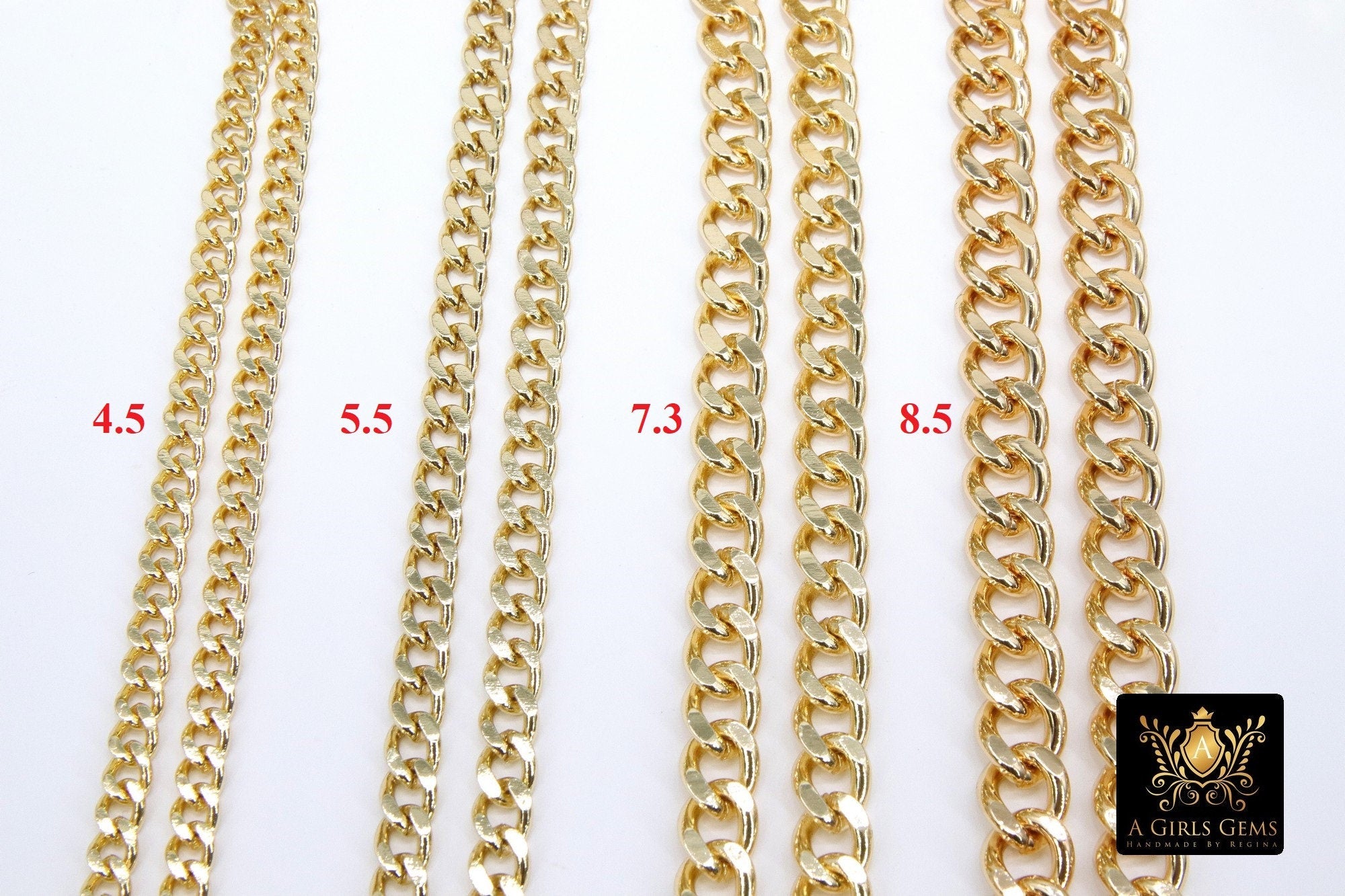 This chain has a diamond cut edge and comes in four different sizes. The pictured chains in the photo shows the width sizes of each chain. These are plated steel chains and you will find them to be more of the gold plating that you find on our brass chains as far as the color.