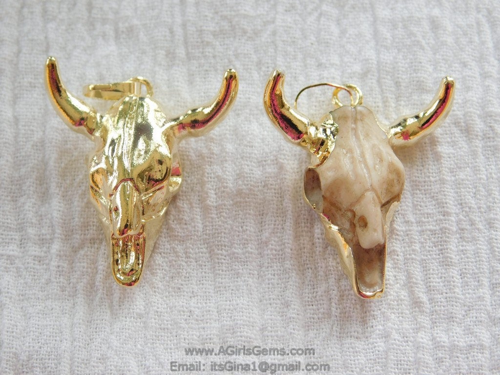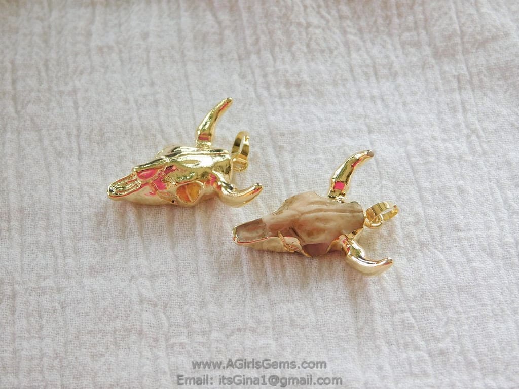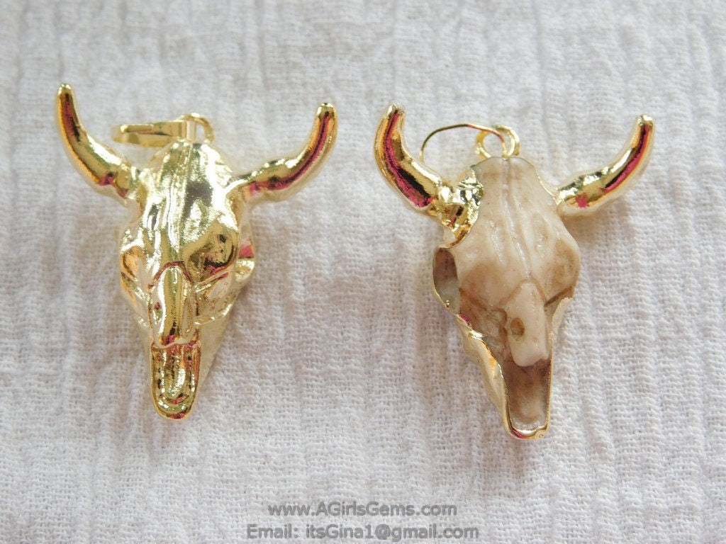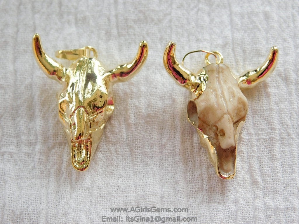 Cow Skull Pendant, Small Mini 24 k Gold Plated Bone Cow Skull Boho Charms #2669, Small Texas Longhorn Bracelet or Earring Charms