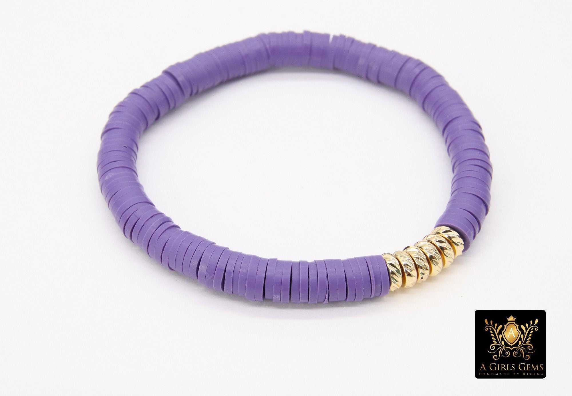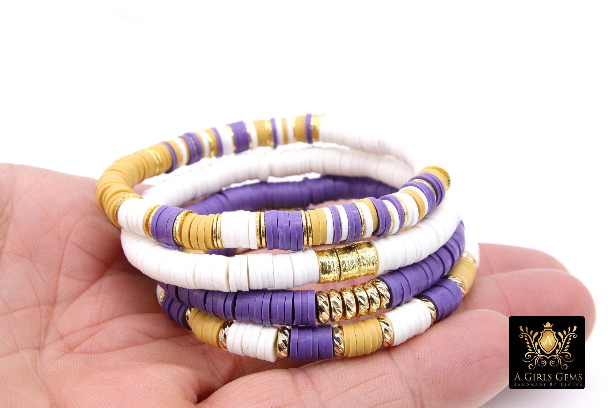LSU Heishi Beaded Bracelet, 6 mm Purple White Gold Stretchy Bracelet #795, Rondelle Heishi Tigers Mom Team Spirit Clay Beaded Bangles
