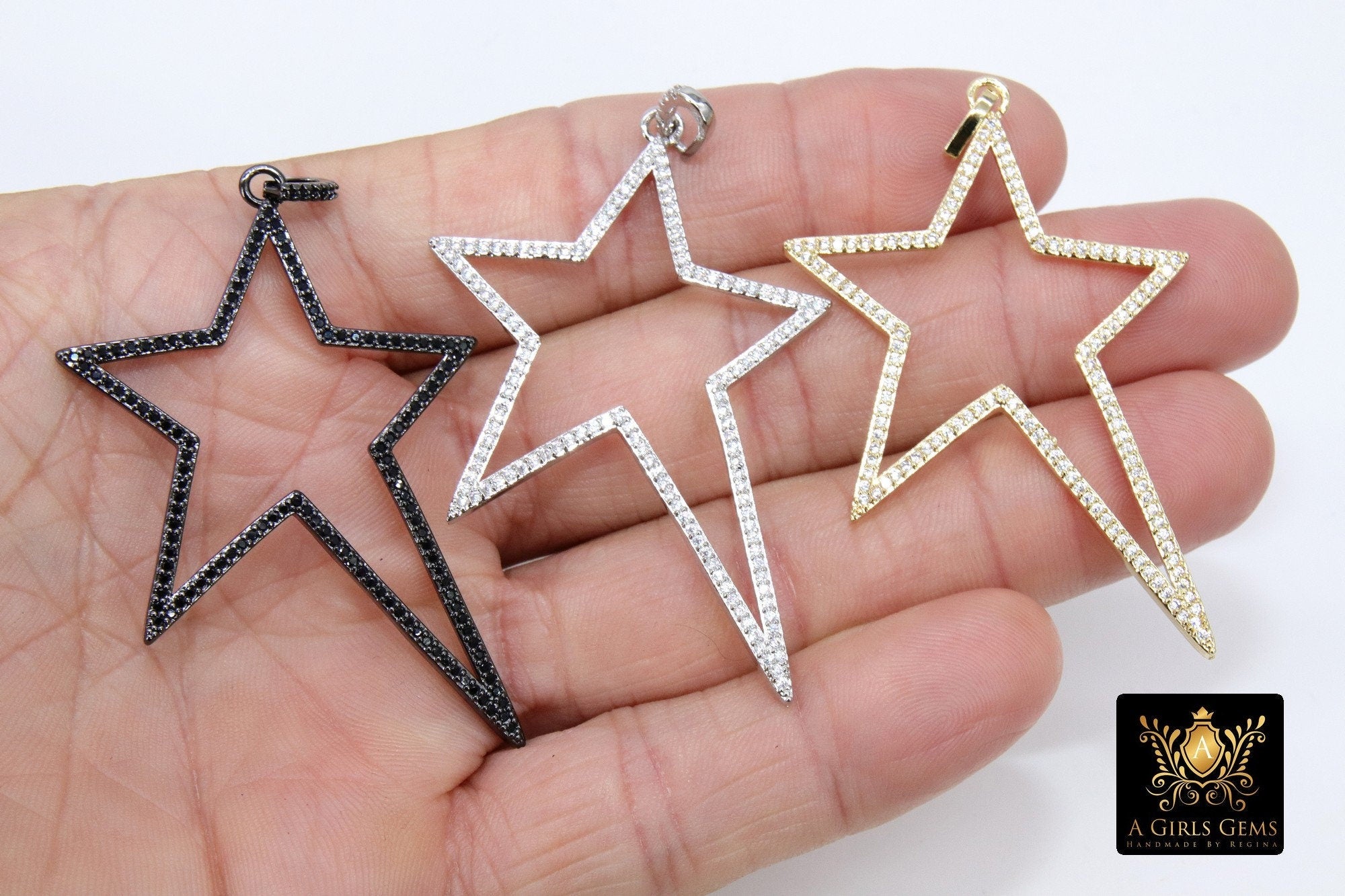 Star Crystal Charm Pendants, Gold CZ Micro Pave Large Black Starburst #791, Silver Star 45 x 61 mm