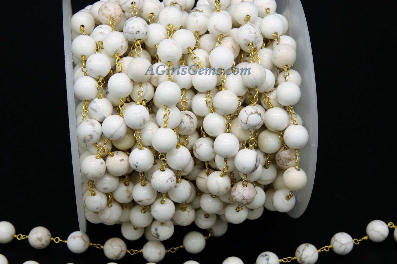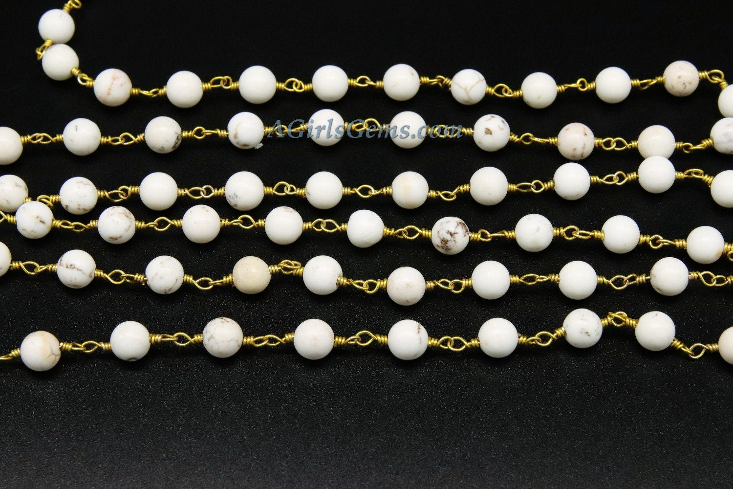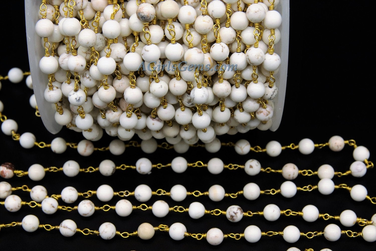 Turquoise Rosary Chain, White Turquoise Rosary Chain *NEW Shiny* 22 k Gold plated Magnesite Howlite Cream Stone Rosary By the Foot Chains
