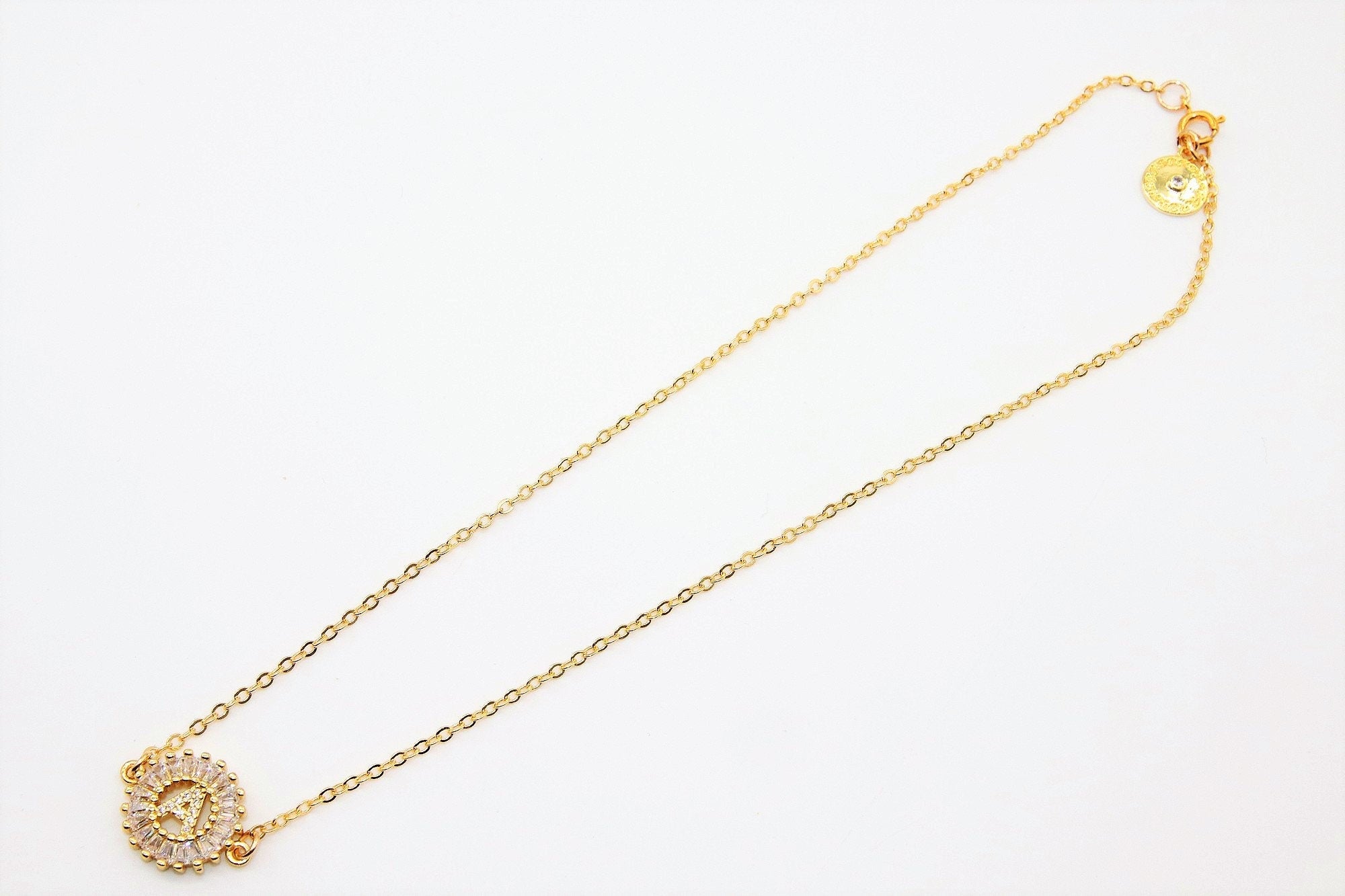 14 K Gold Initial Chain Necklace, Cubic Zirconia Baguette Round Disc Letters in Choker or Bolo Bracelet, Personalized Alphabet