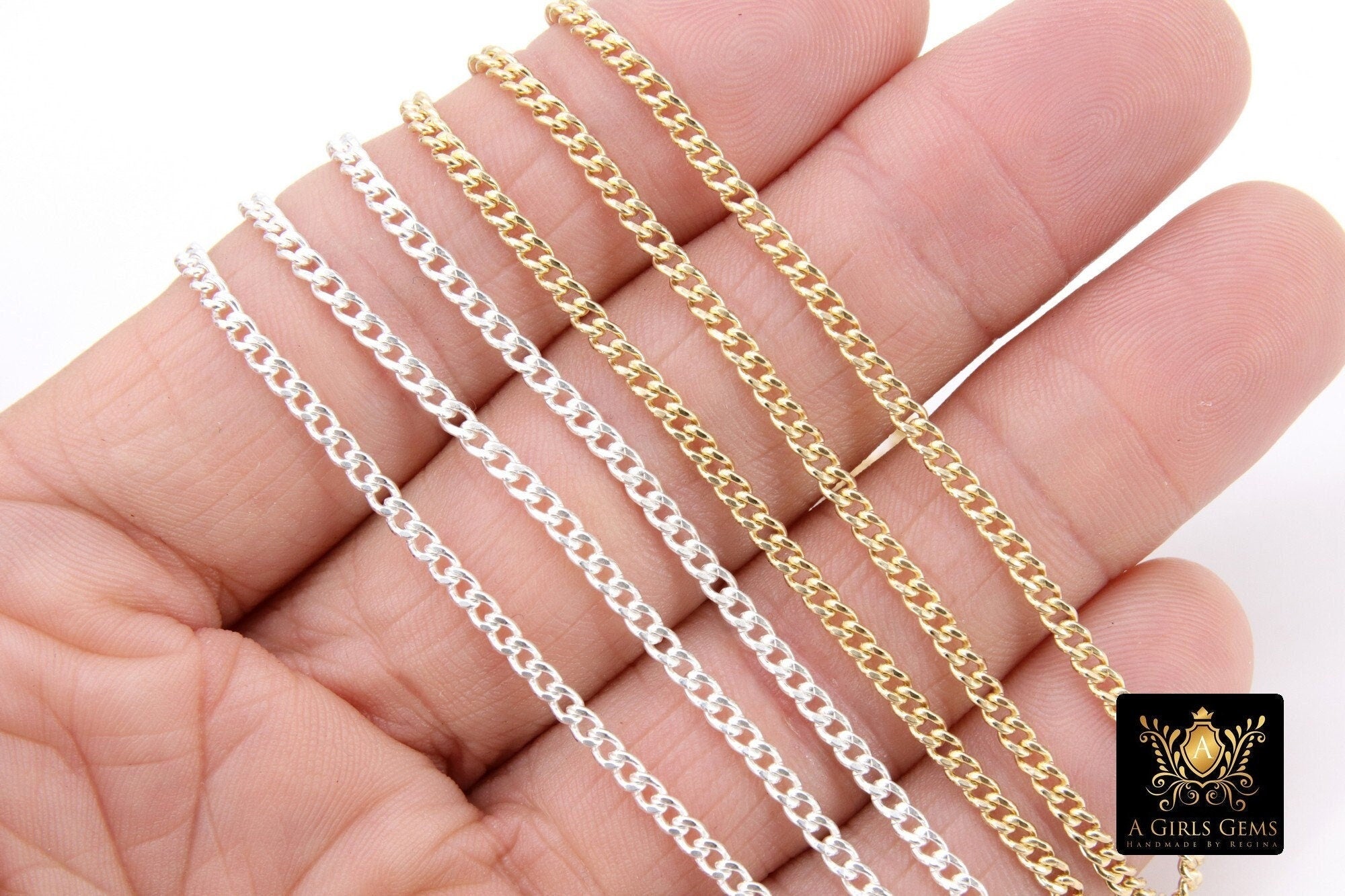 Notes Regarding Chains: All of our chains are cut in a continuous chain unless it is the end of a roll. We do not cut 10 feet in 1 foot sections. Any 925 Sterling Silver or Silver plated chains will tarnish. We suggest keeping your chains in a sealed jewelry bag to help prevent this. I'm sorry but all cut chains are non refundable. We recommend you try a foot sample before large purchases. Stainless steel chains come in gold or silver and are known for their non tarnishing properties. We don't control the colors, where gold may be applied on tight weave or small chains. All of our 14 K Gold Filled chains, charms, or findings are Genuine 14/20 Gold Filled. To be called gold filled by US LAW, the plating needs to be very very thick, at least 5% of weight. We do not replace for slight imperfections, defects, or variations in factory made chains, slight variations from photos, or minor detail damage issues.