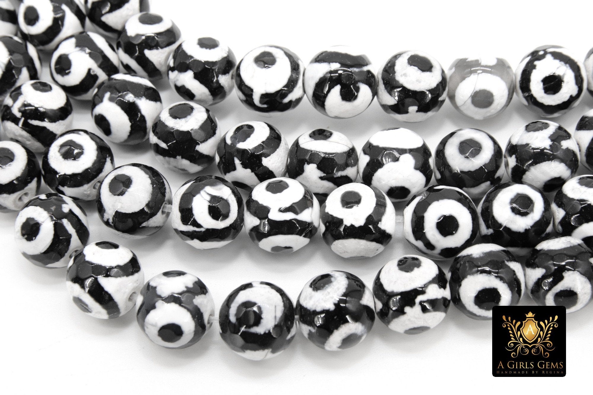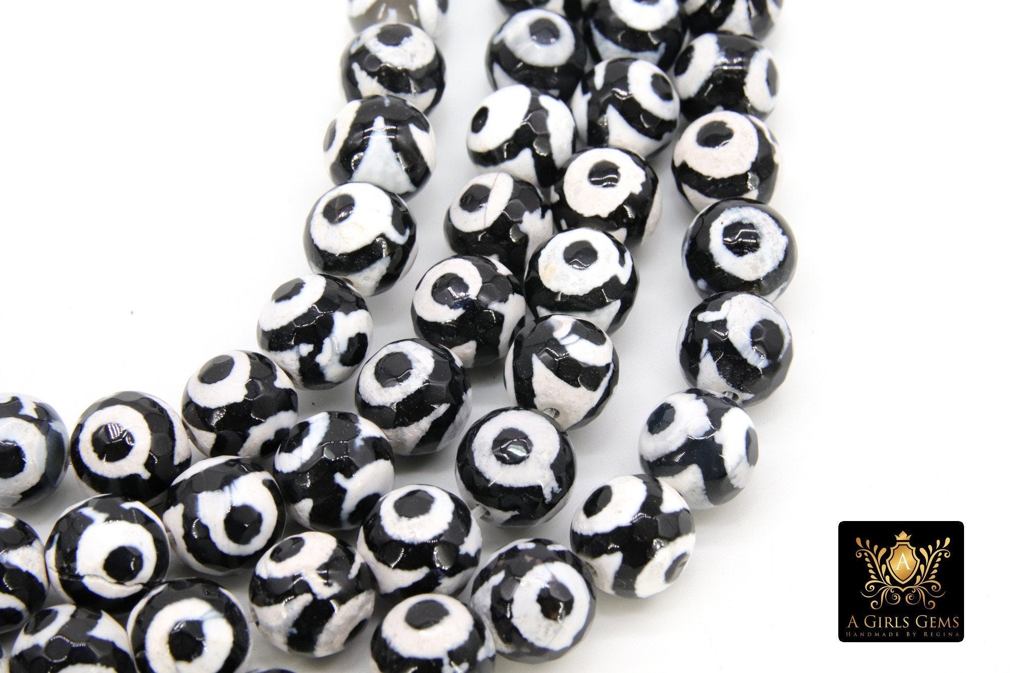 Tibetan Natural Faceted Agate Beads, DZI Agate in Black and White Dot Color Beads BS# 10, sizes 10 mm 15 inch FULL Strands