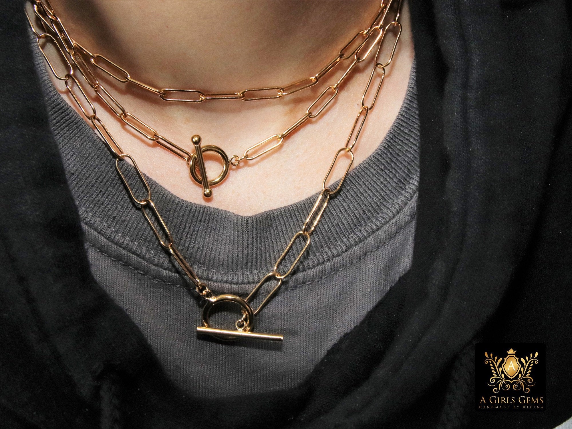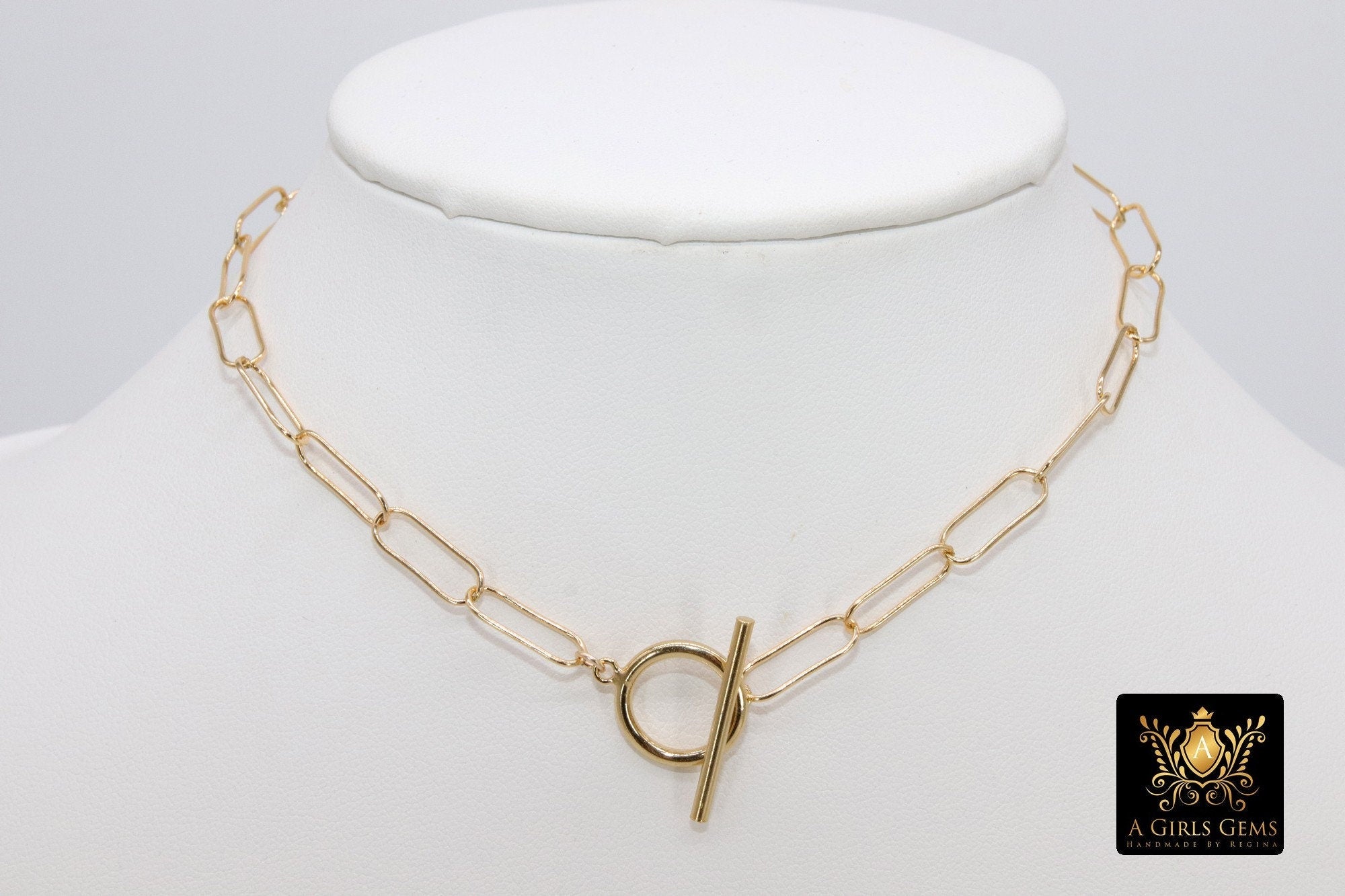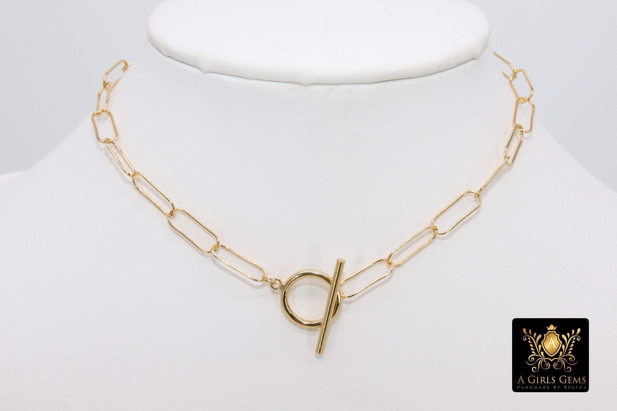 14 K Gold Large Toggle Bar Necklace, Large Double Wrap Rectangle Oval Chain Link Everyday Choker