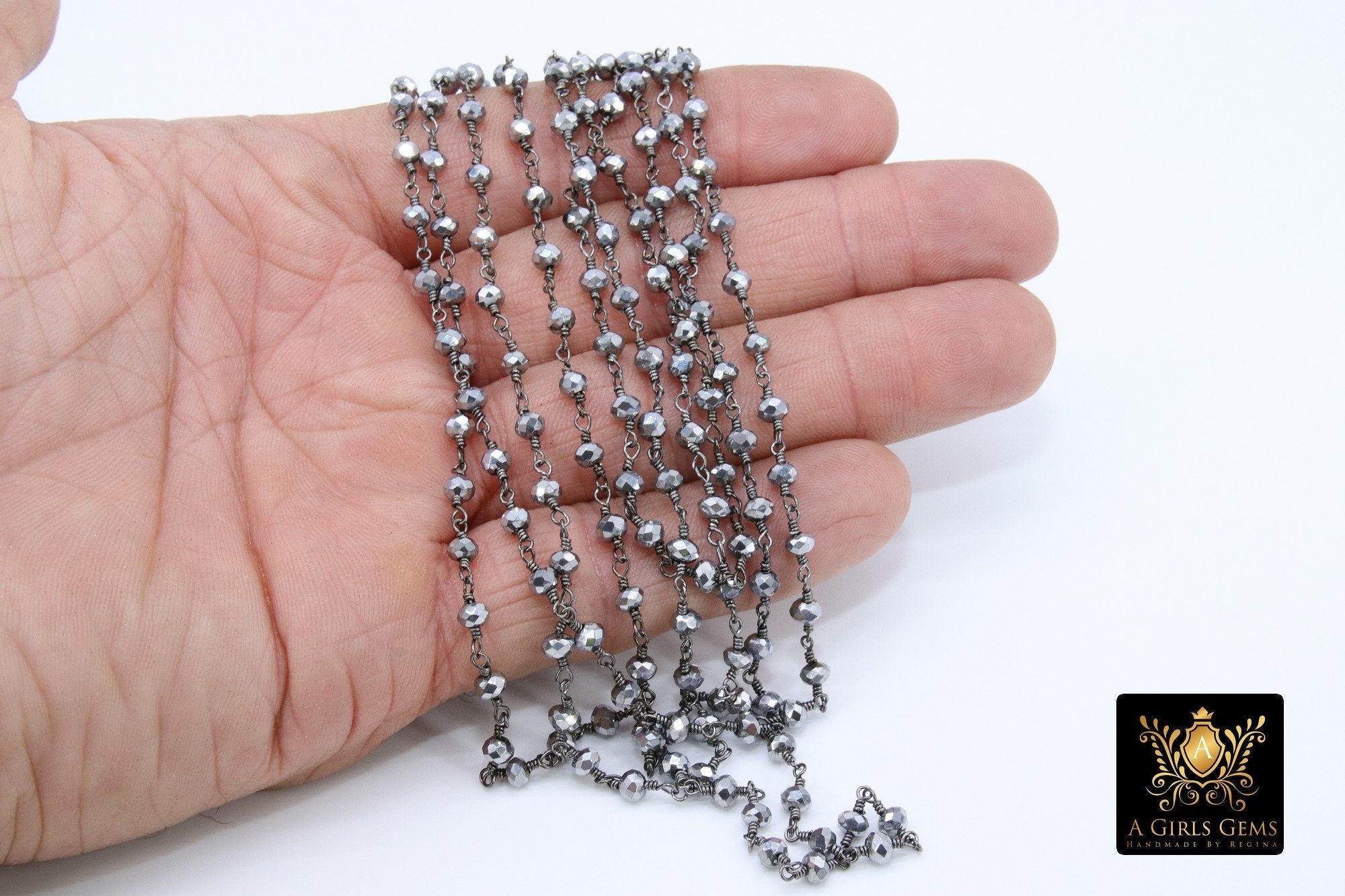 Gunmetal Black Crystal Rosary Chain, 4 mm Wire Wrapped Crystal Beads, Unfinished Jewelry Chains Bulk
