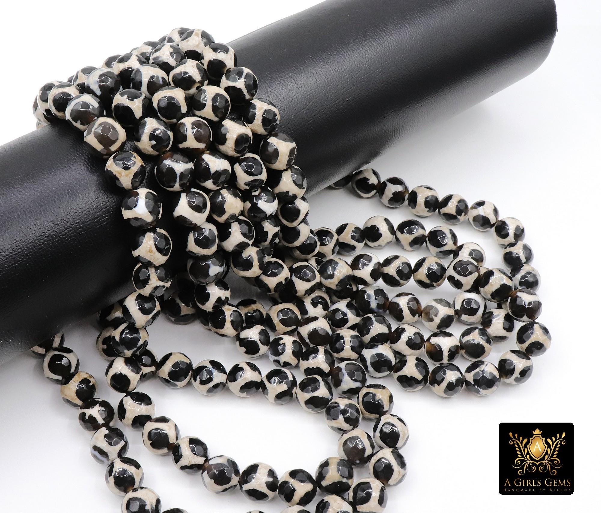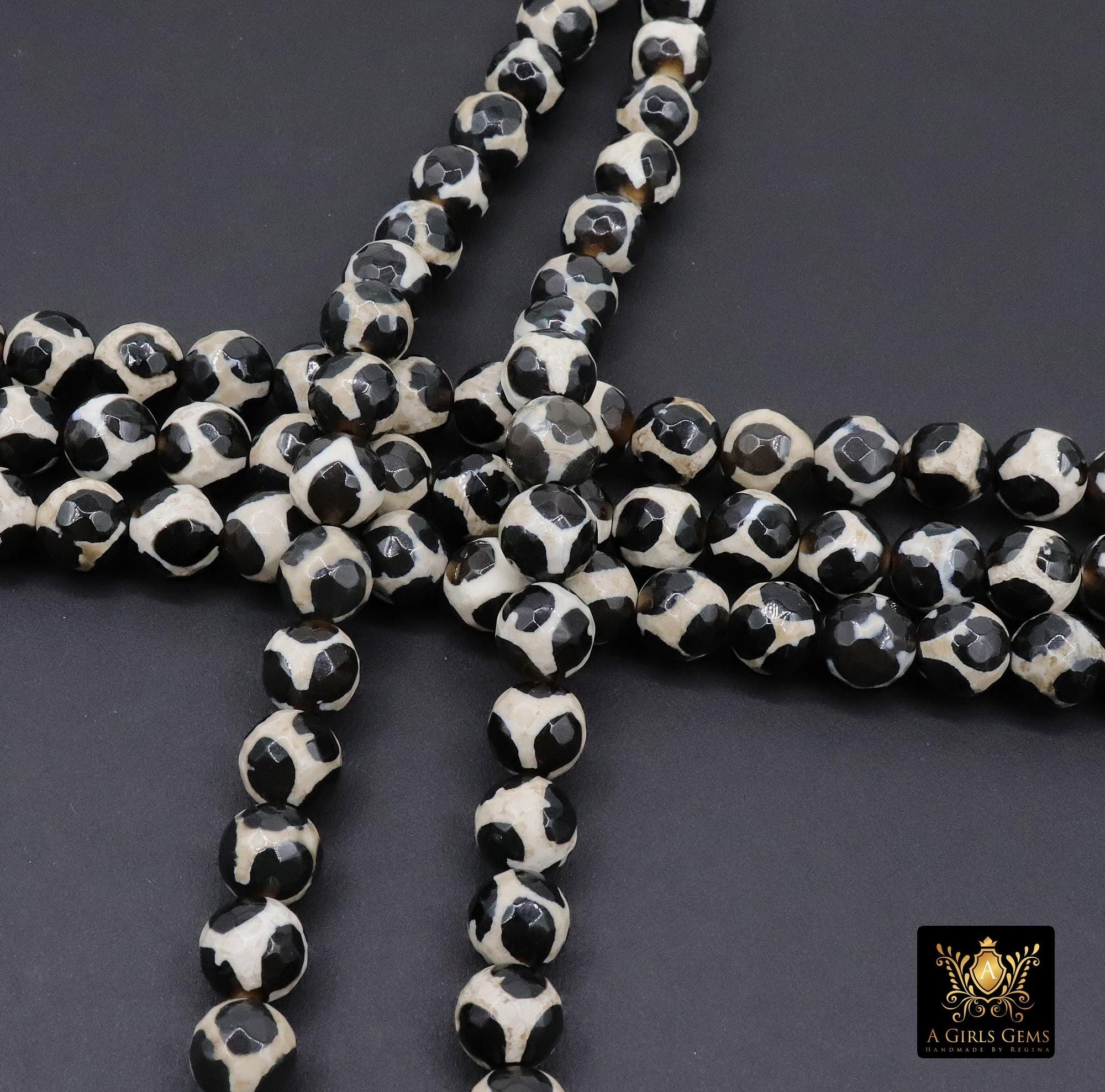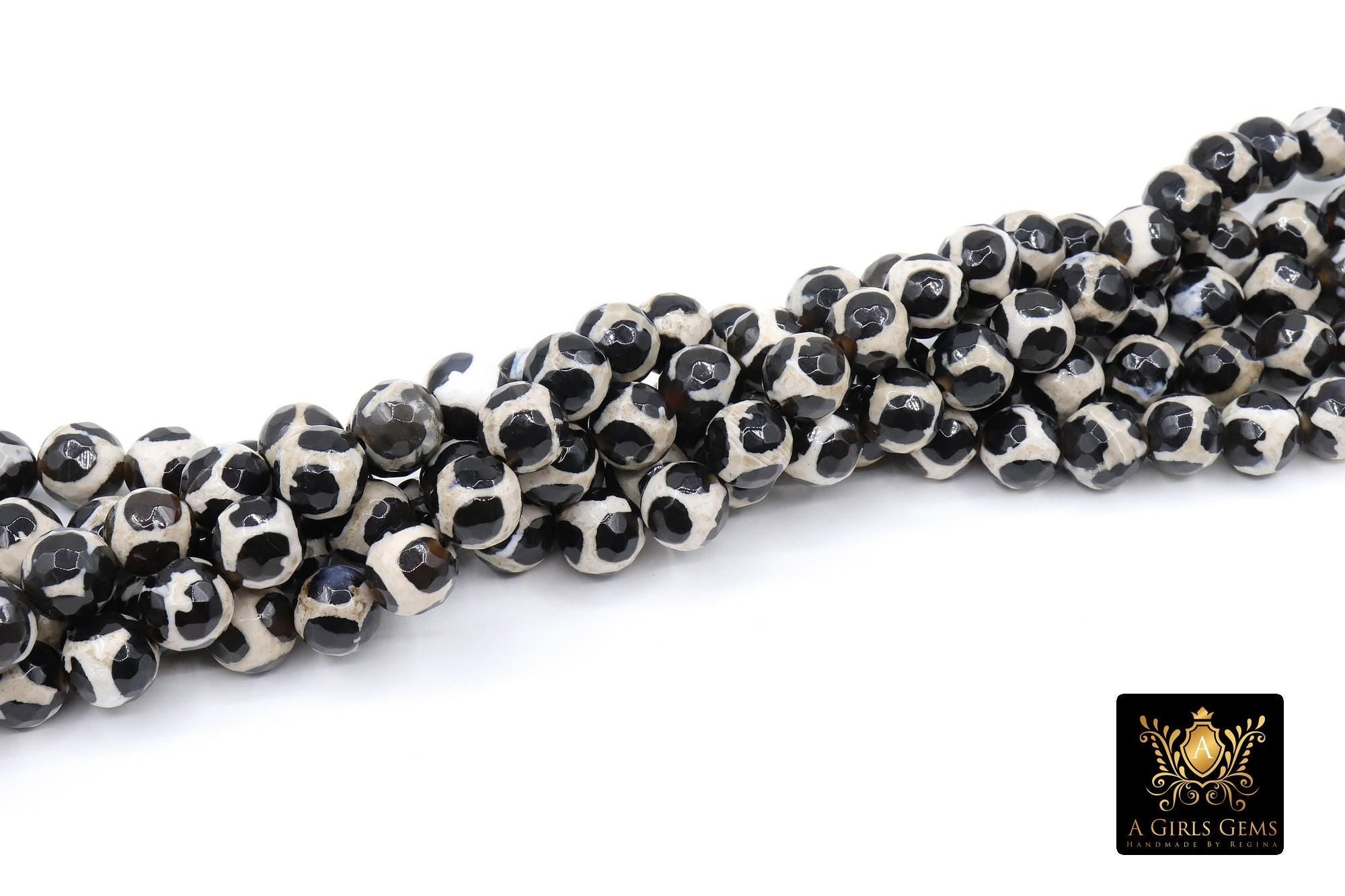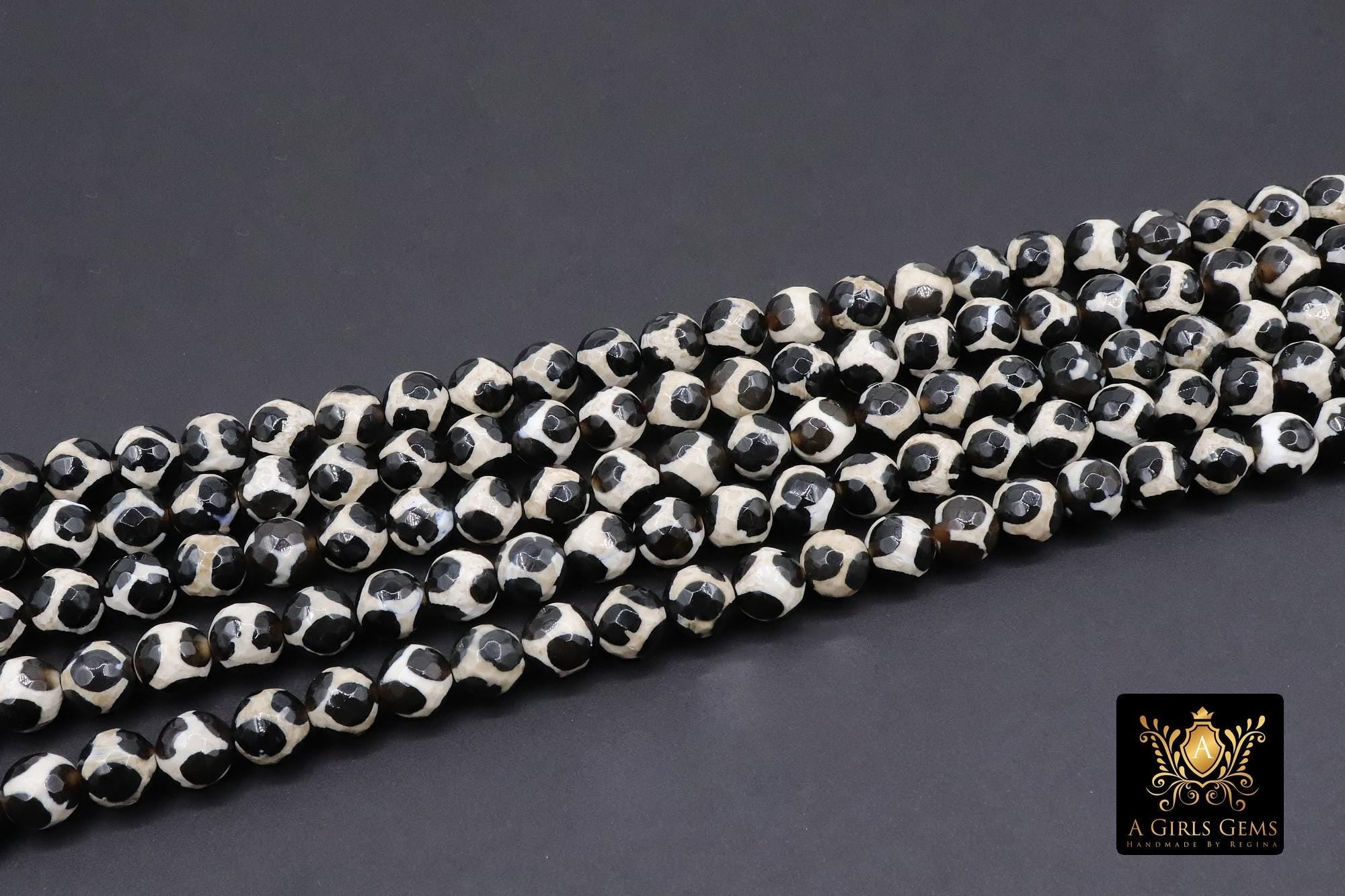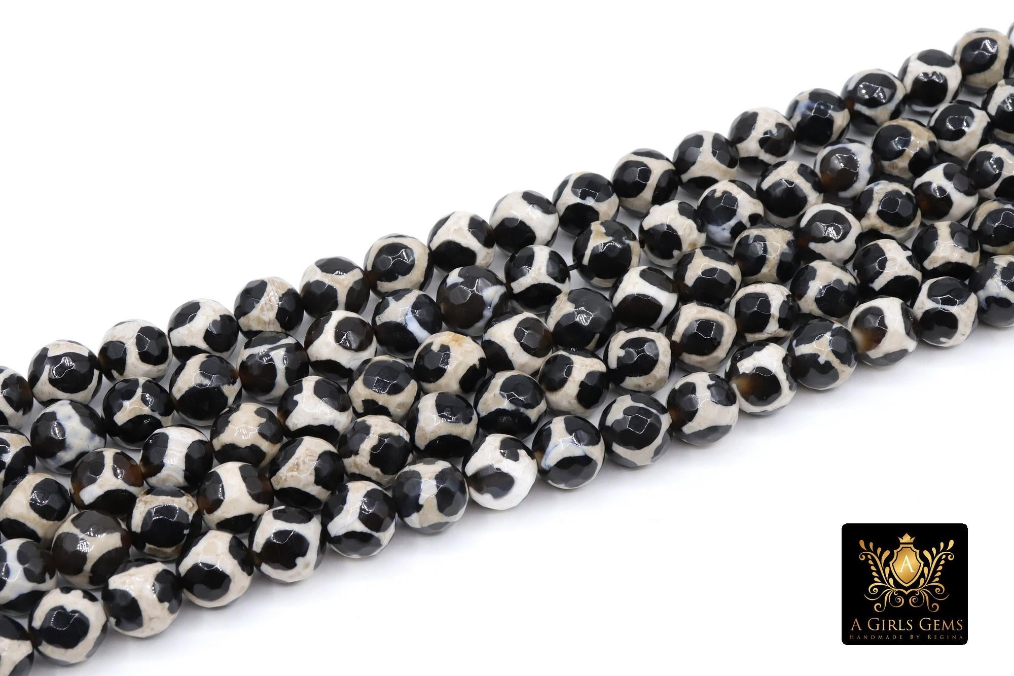 Tibetan Natural Faceted Agate Beads, DZI Agate Black and Beige White Color Beads BS #65, sizes 6 mm 8 mm or 10 mm 15 inch FULL Strands