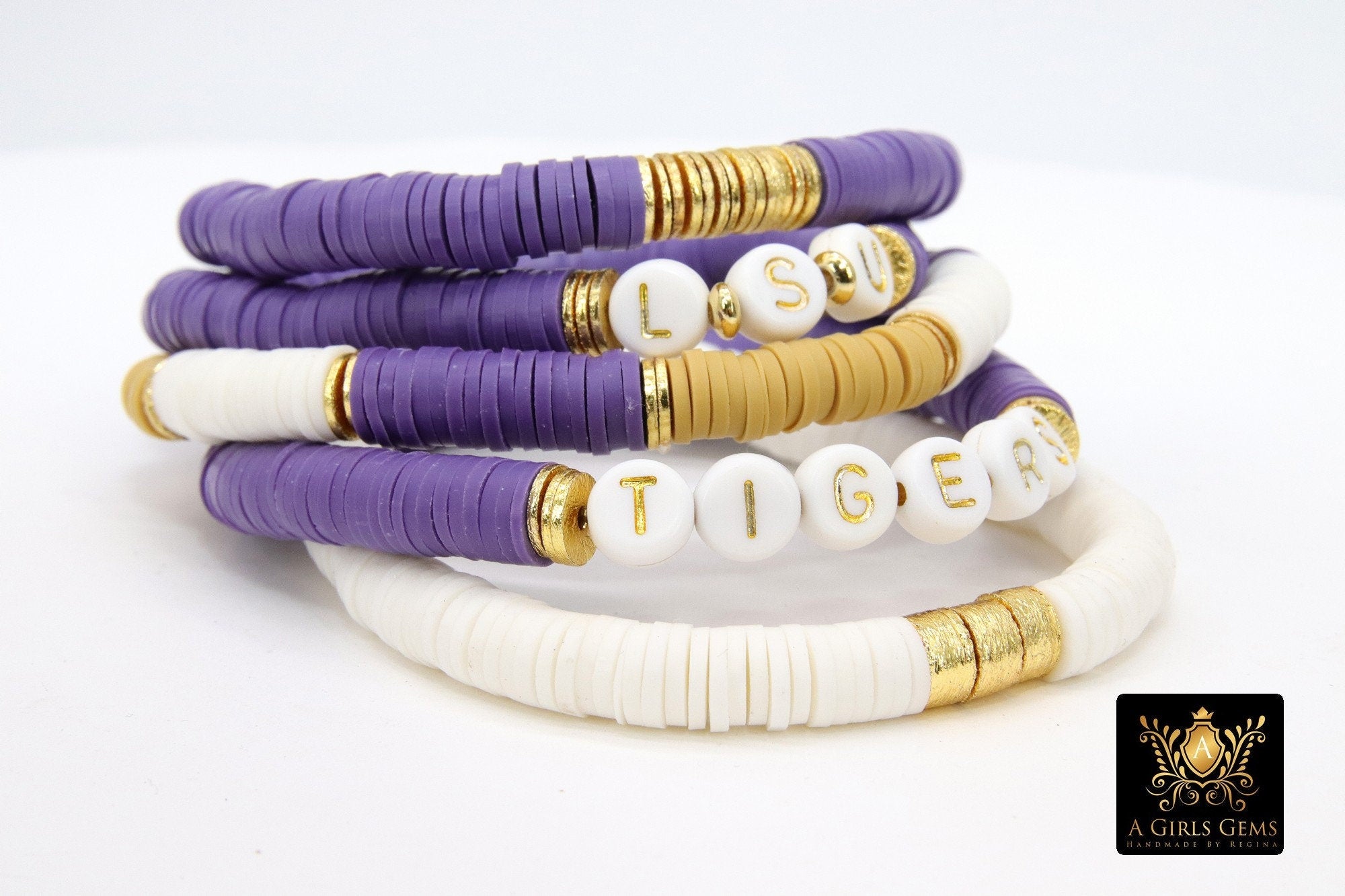 LSU Heishi Beaded Bracelet, 6 mm Purple White Gold Stretchy Bracelet #795, California Tigers Mom Team Spirit Clay Beaded Bangles