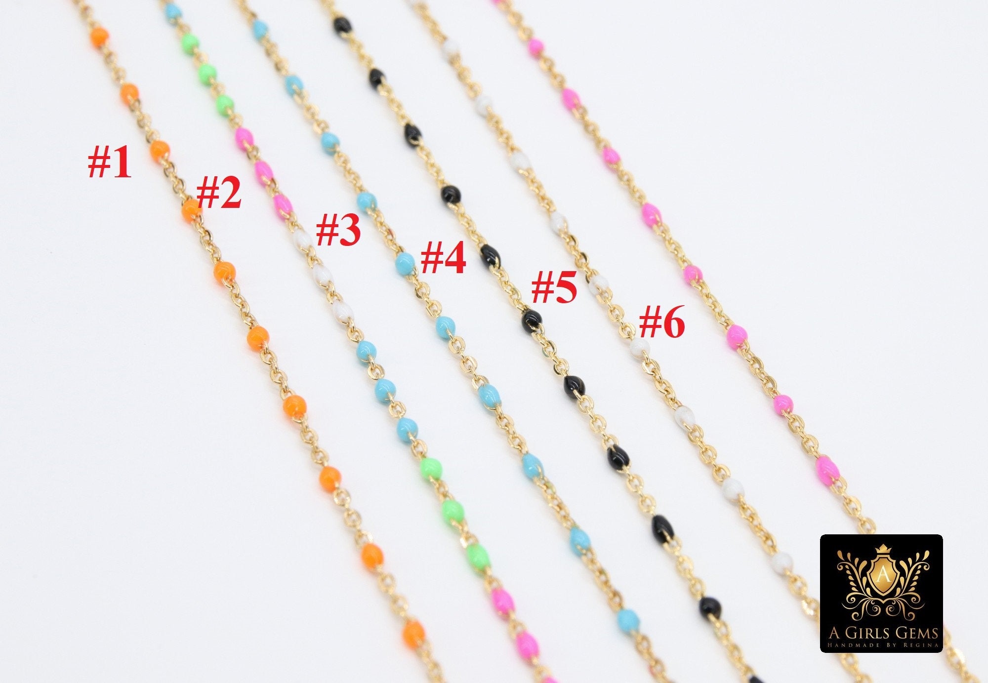 Made to be adjustable with three welded rings to pick from. The length you pick is the total length of the bracelet. Choice of color of beaded enamel Satellite chains in 14 K Gold Filled. 2 mm Bead sizes, bead placement may vary per chain colors. Comes with a Tiny 14 K Gold Filled components and each jump ring is welded together at approximately a half inch apart. Please message us if you need more information.