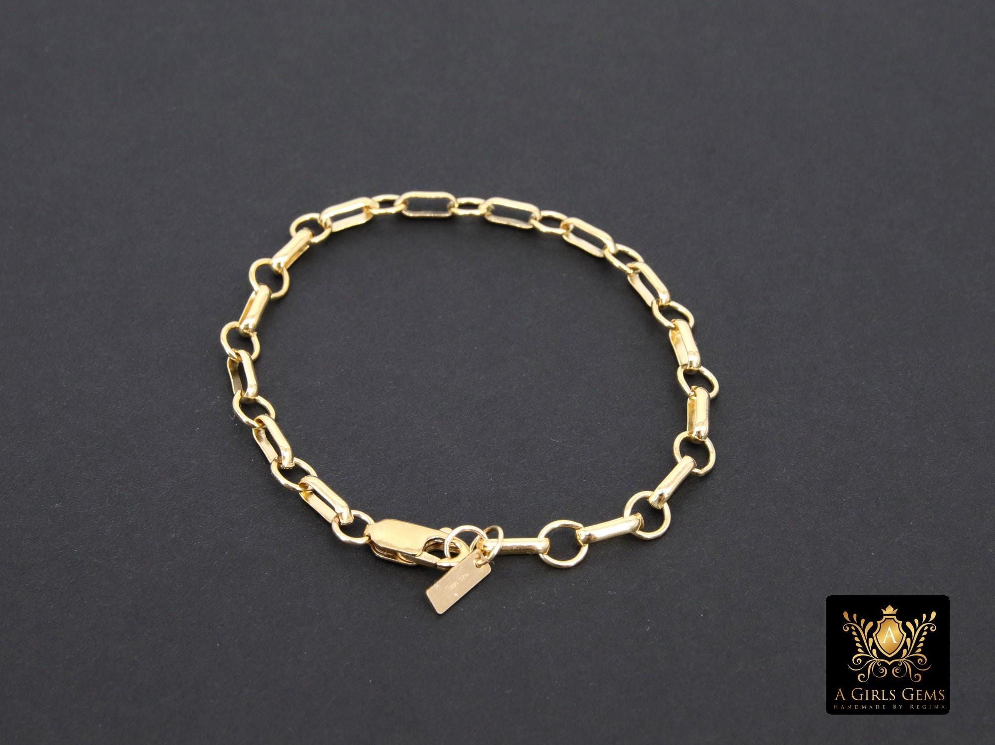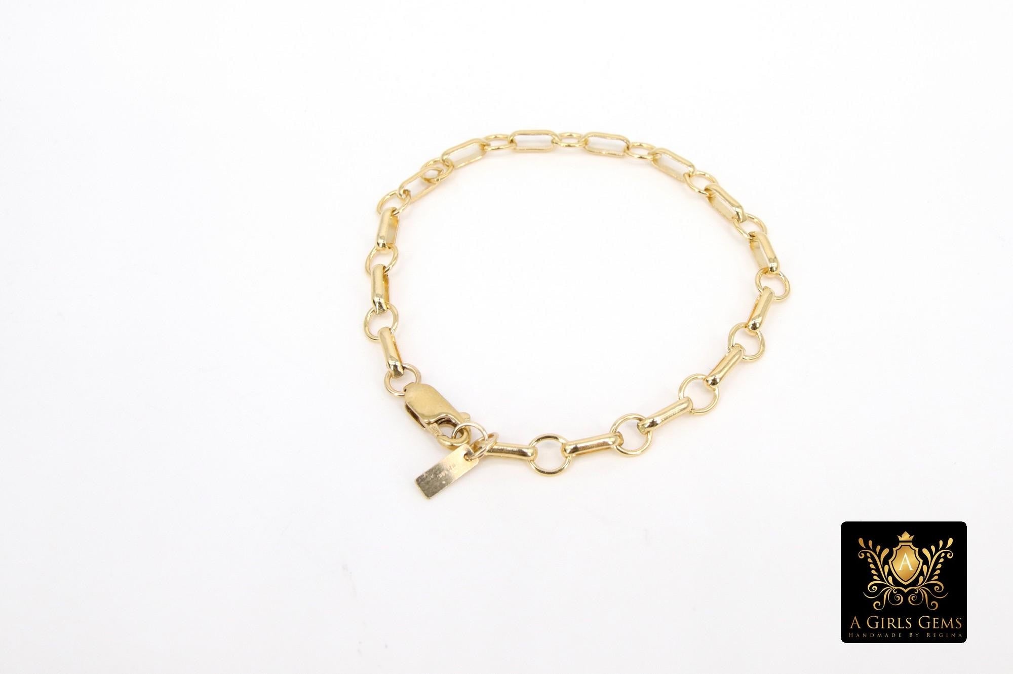 14 K Gold Filled Paperclip Chain Bracelet, Long Short Rolo Chain Link Bracelet, Rectangle Charm Stamped 14/20