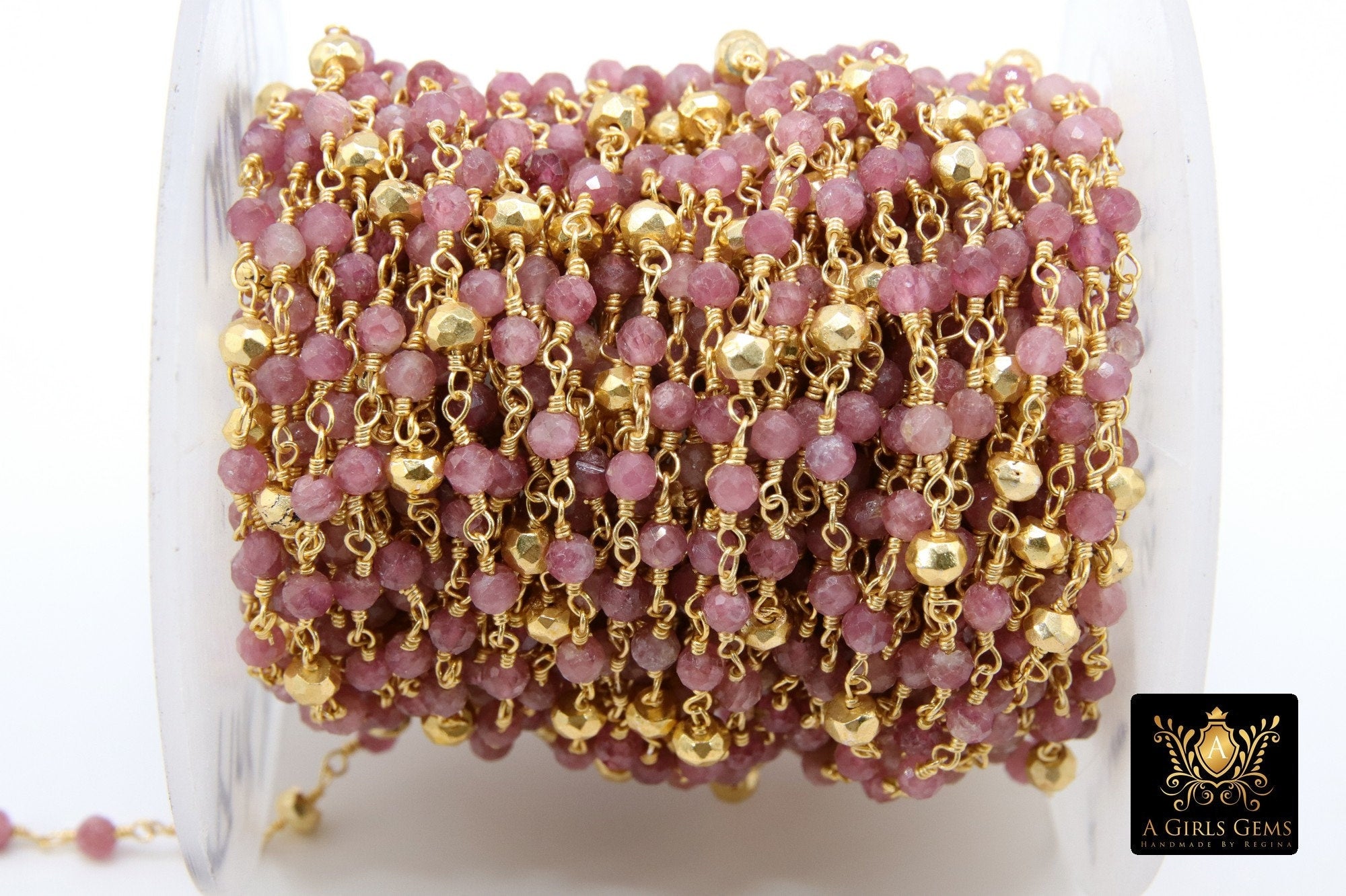 22 k Gold Natural Pink Tourmaline Rosary Chain, Unfinished 4 mm Gold Pyrite Beaded Wire CH #449 Wrapped Fuchsia Diamond Cut Gemstone Beads