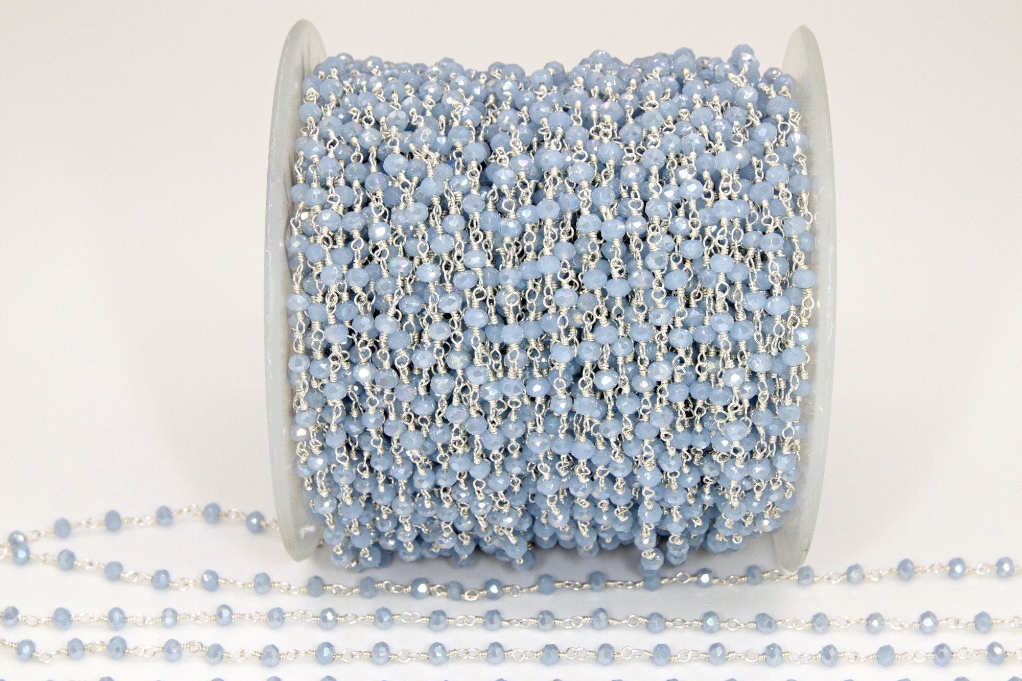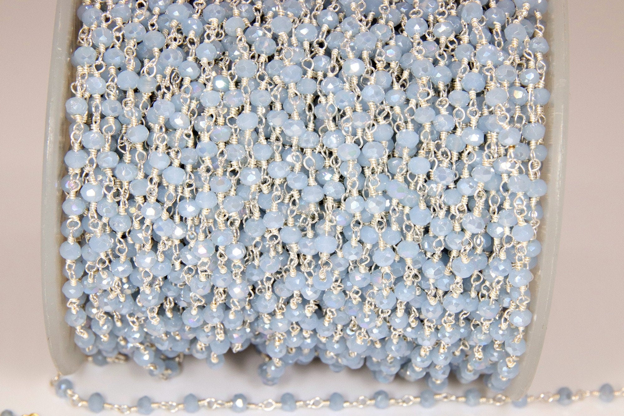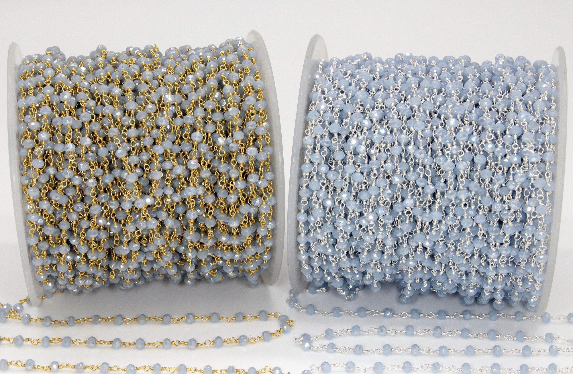 Baby Blue Chalcedony AB Rosary Gold Chain, Black or Silver Wire Wrapped Chains CH# 325, 4 mm Beaded Unfinished