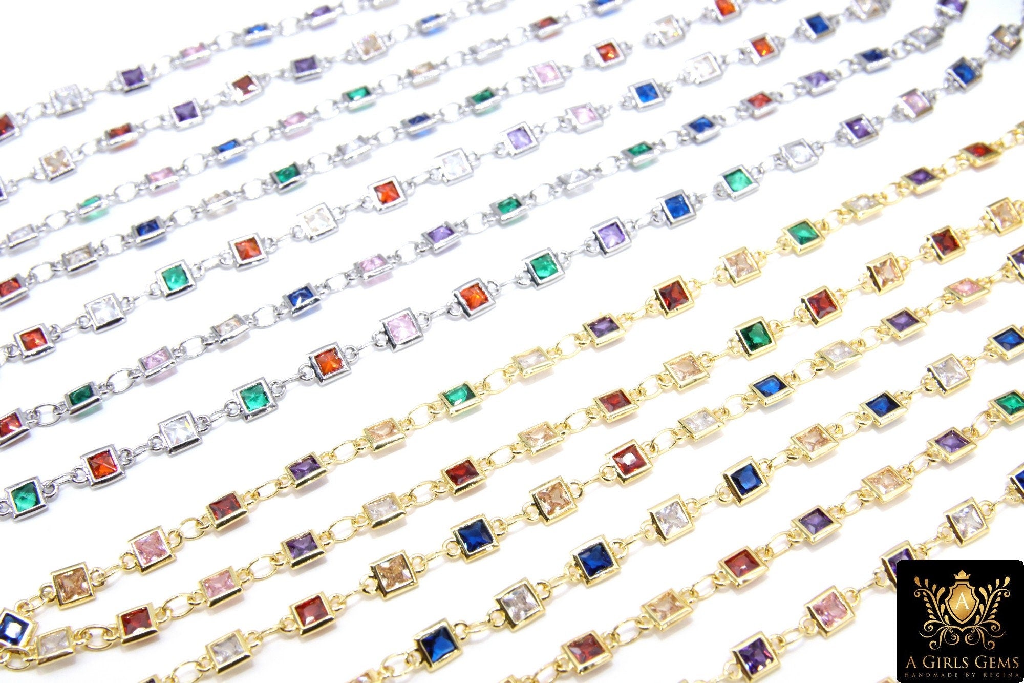 Genuine Cubic Zircon Chains, 4 mm Square Bezel Rainbow Chains CH #567, Silver or Gold Plated