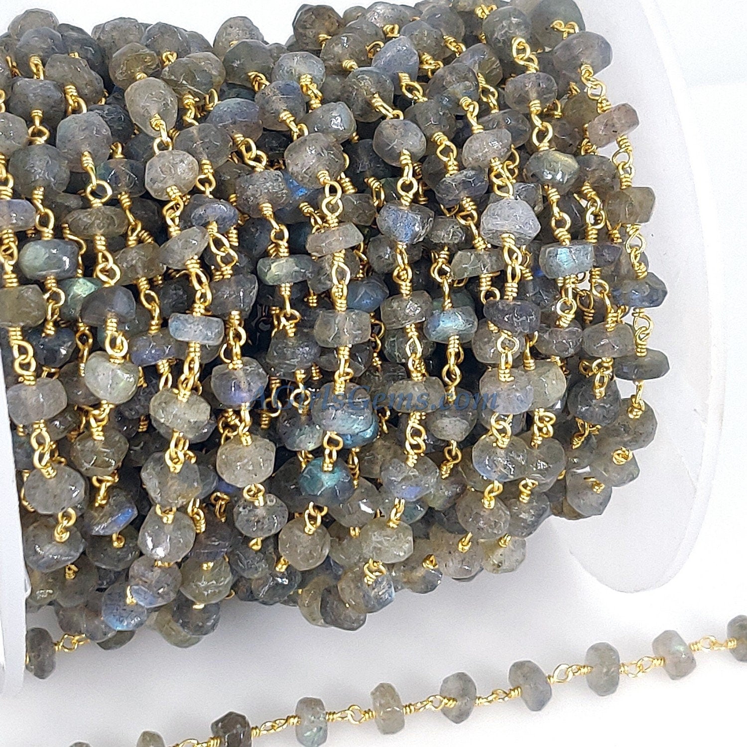 22k Gold Plated Labradorite Gemstone Beaded Rosary 6 mm Chains, Wholesale Boho Wire Wrapped Rondelle Jewelry 1 5 10 feet Chain Roll Bulk