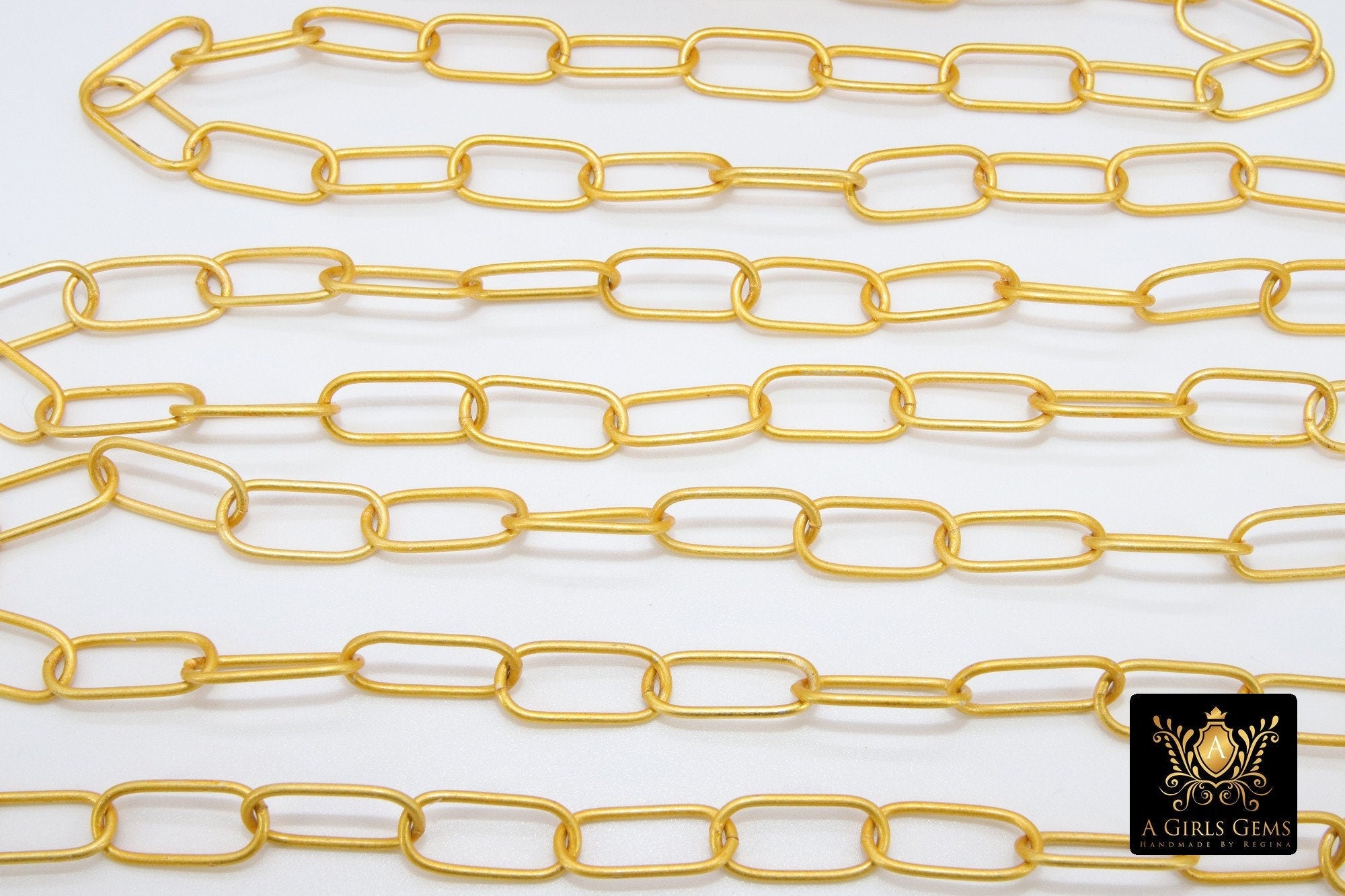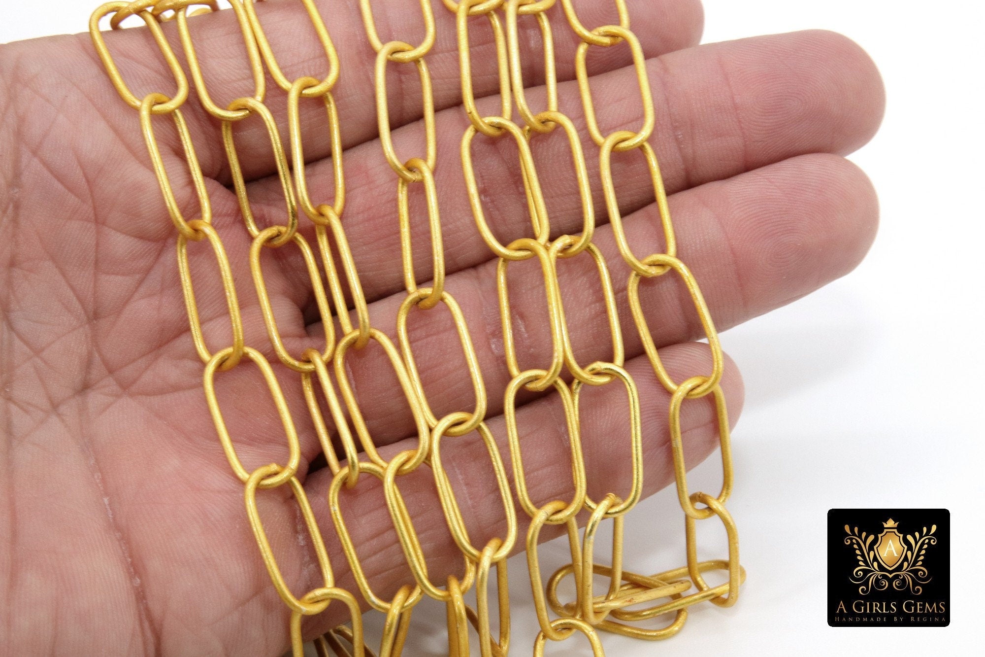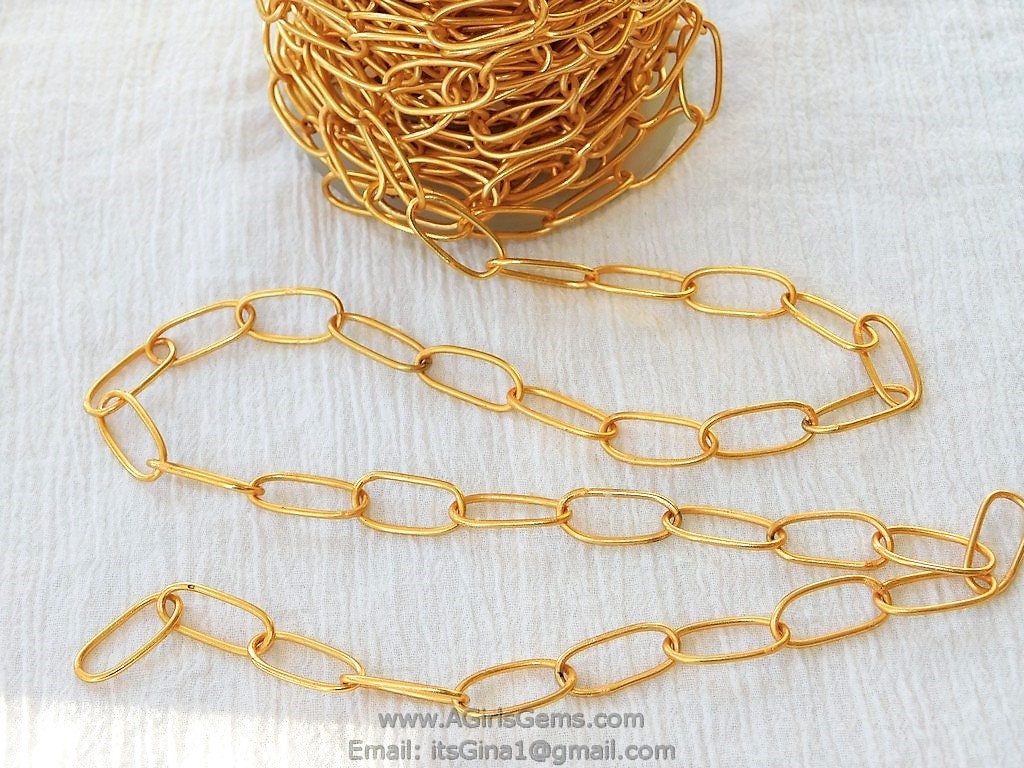 22 K Gold Large Oval Chain Link Chain Gold plated with 22 k matte gold Connector Chain Wholesale 10 mm x 20 mm Chains 1 5 10 feet Chain Shipped from USA. Chains have been sealed and are plated over brass. These 10 mm x 20 mm links are soldered in between each link.