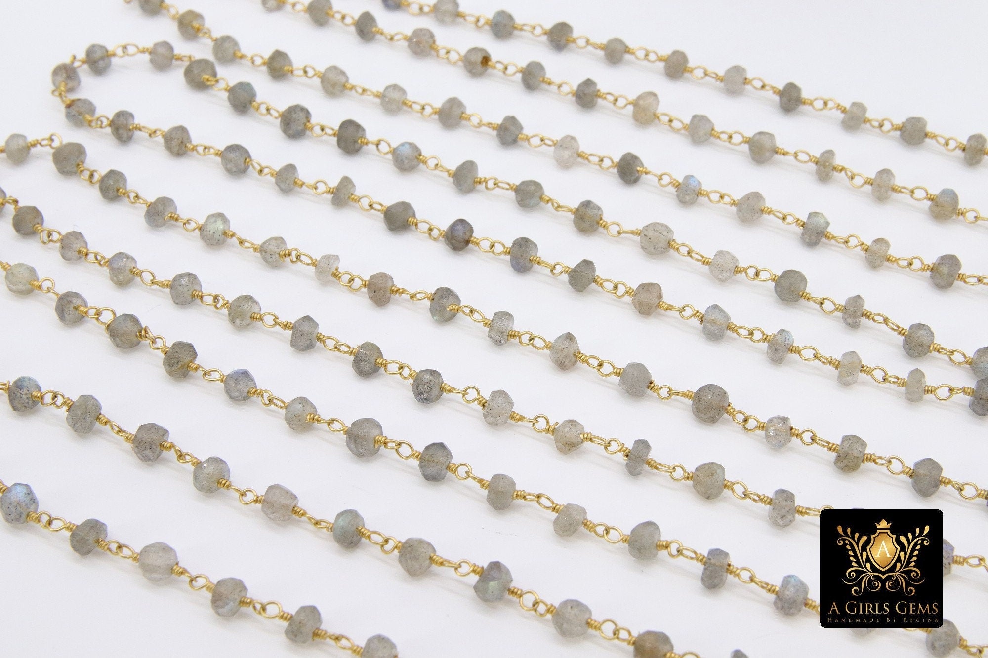 Natural Labradorite Gemstone Rosary Gold Chain, Gray 4 mm Jewelry Chain CH #337, 1 5 10 feet Religious Chain