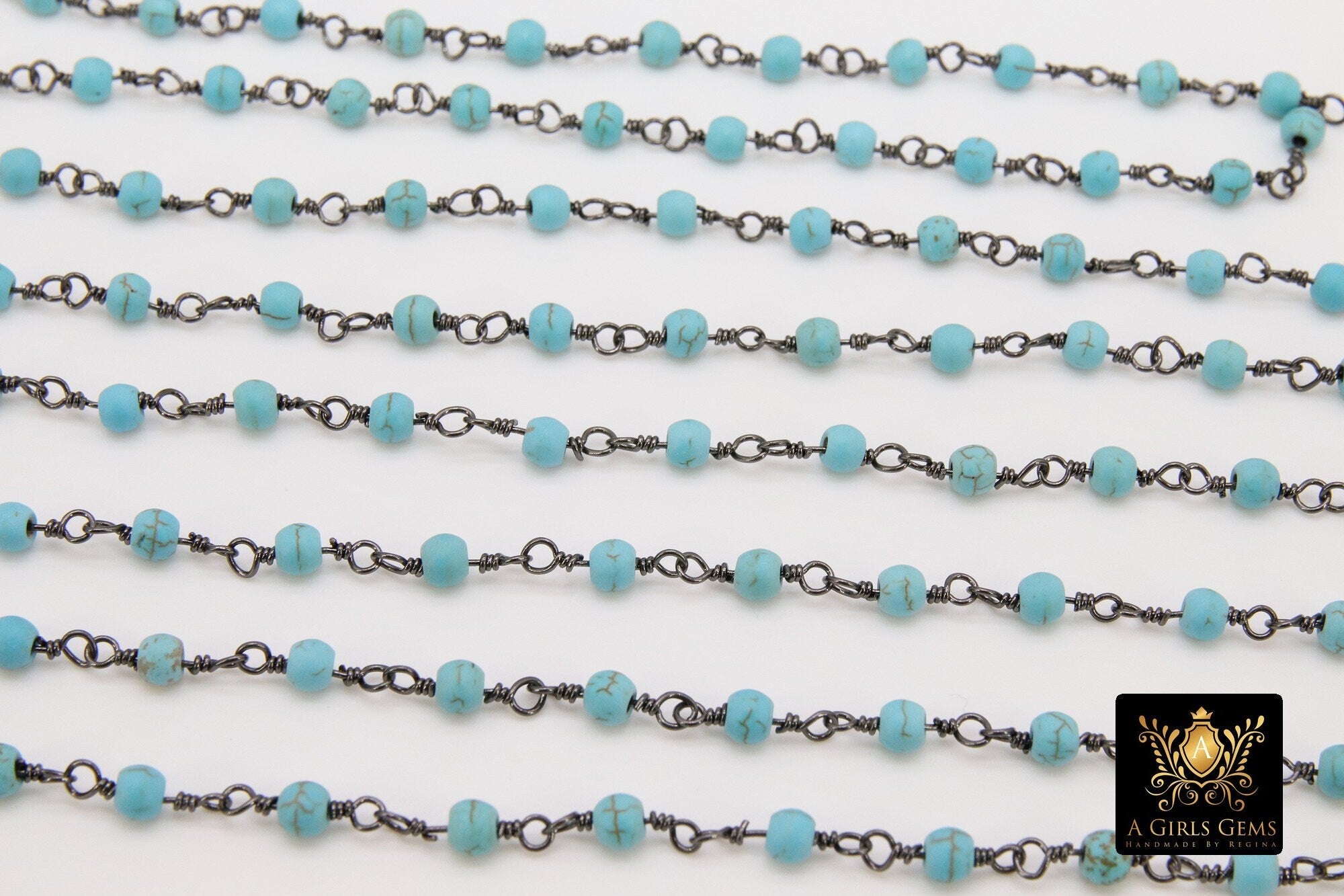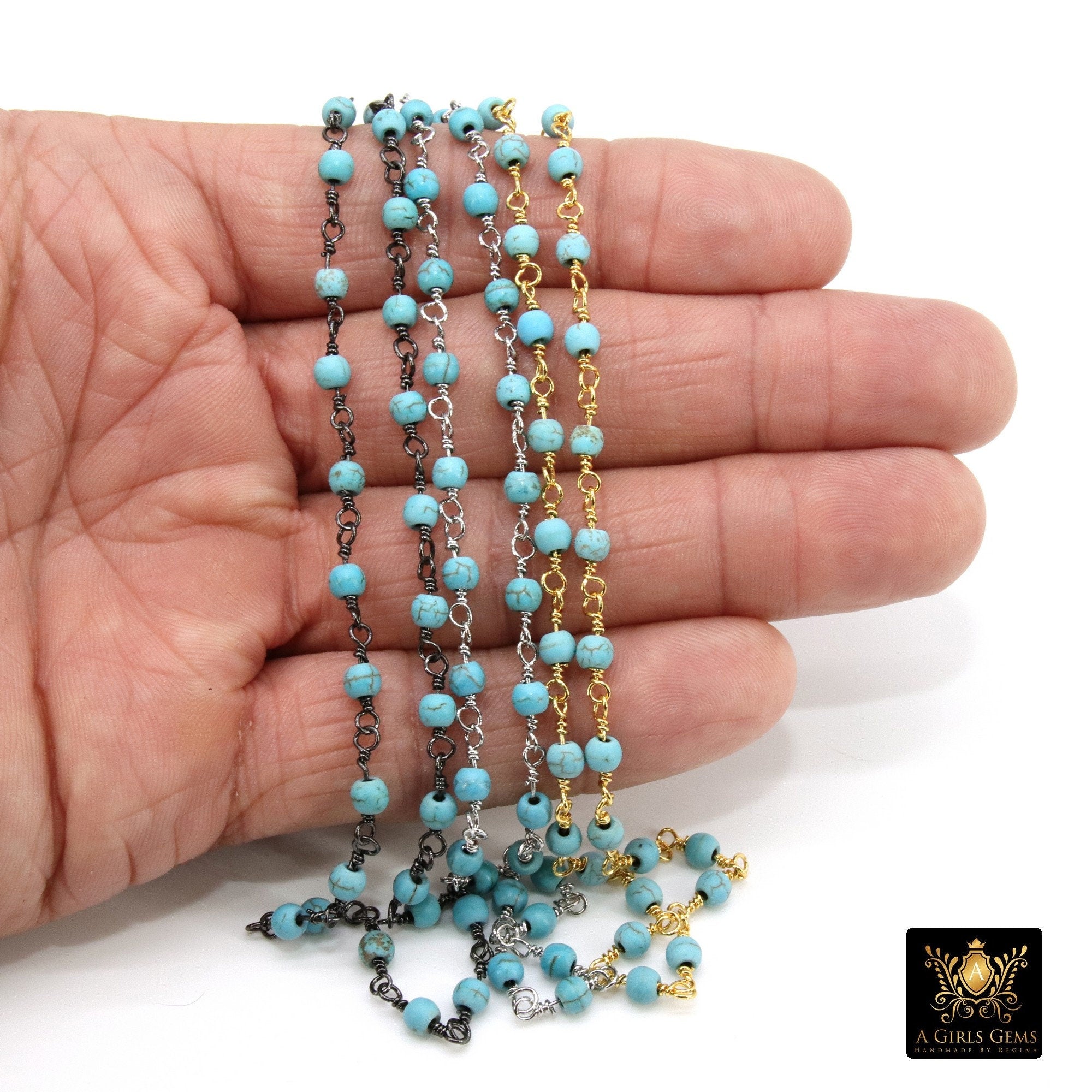 Turquoise Rosary Beaded Chain, 4 mm Wire Wrapped Silver plated Blue Howlite Chain for Necklace Bracelets