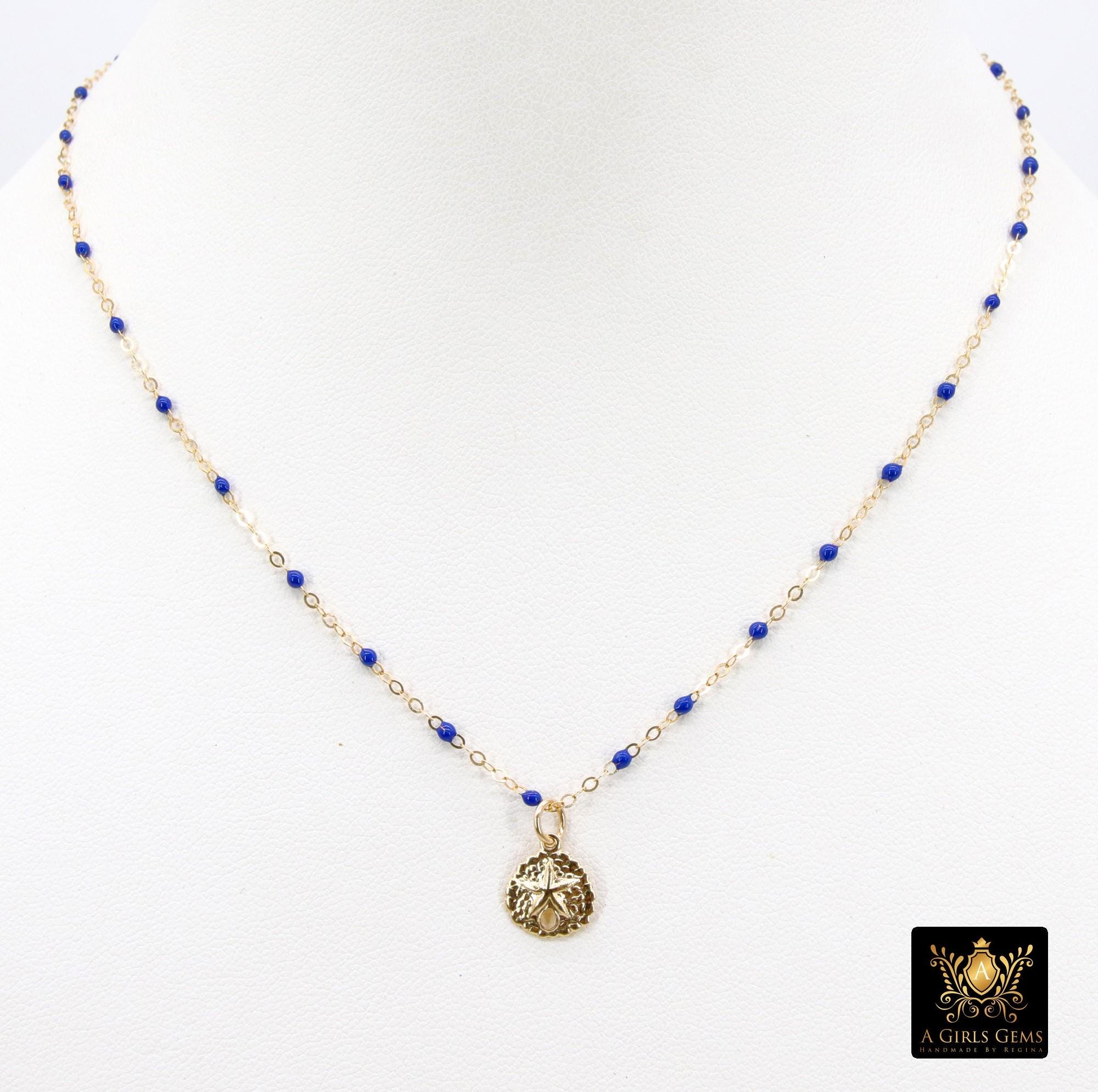 14 K Gold Filled Sand Dollar Beach Necklace, Shown in our Blue Turquoise Gold Satellite Chain Link Charm Choker. Choose Your Color: Fuchsia Pink, Black, Blue Turquoise, Navy Blue, Multi Color, White, Purple, Lavender