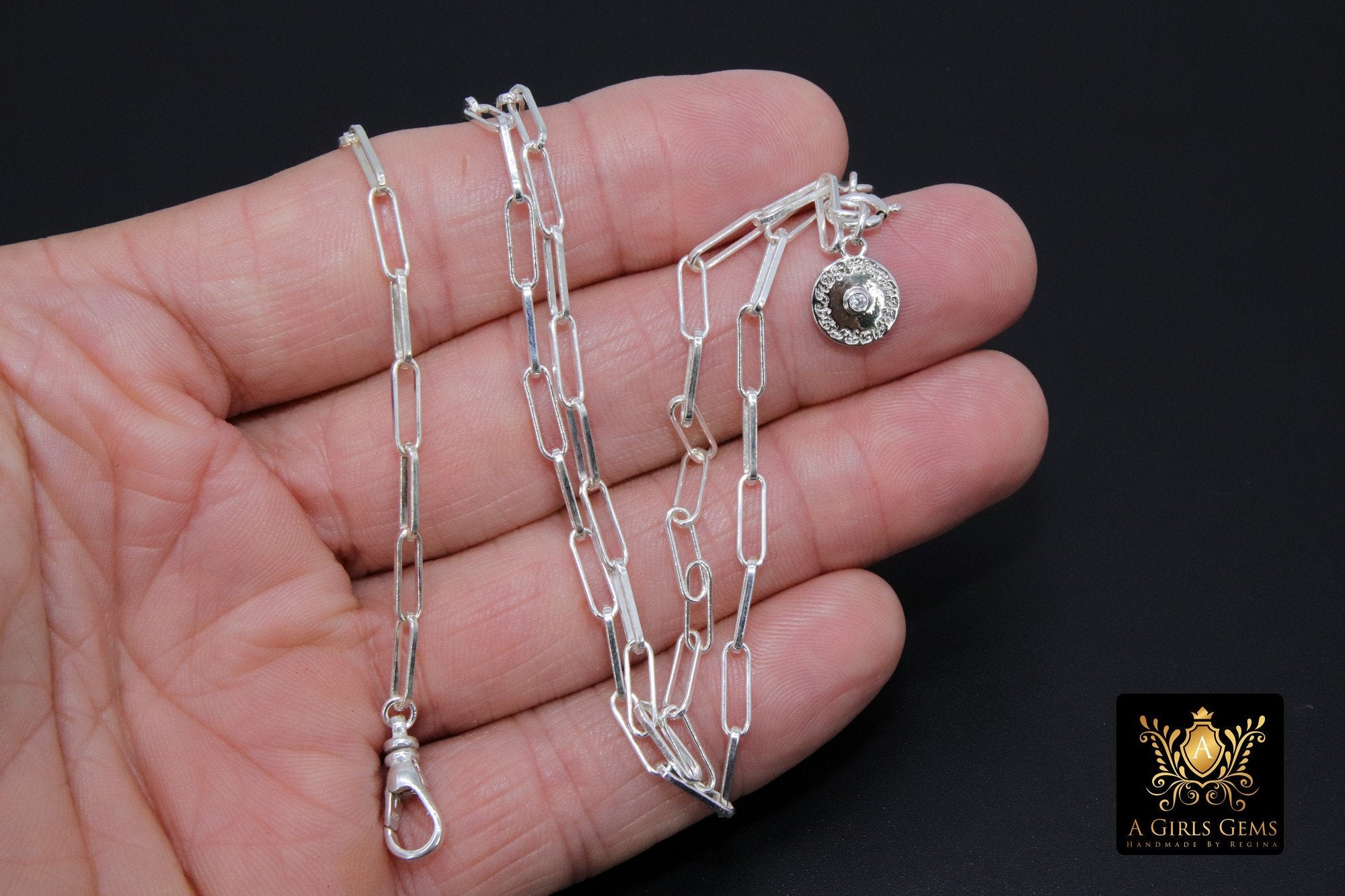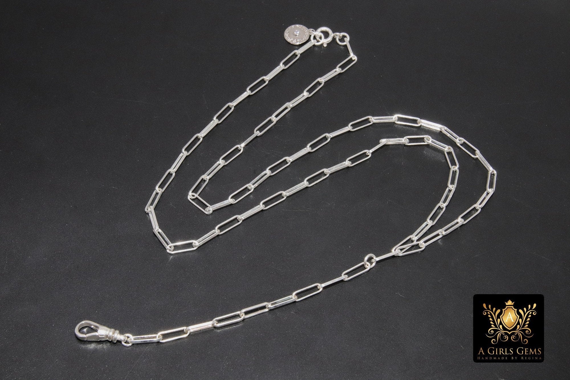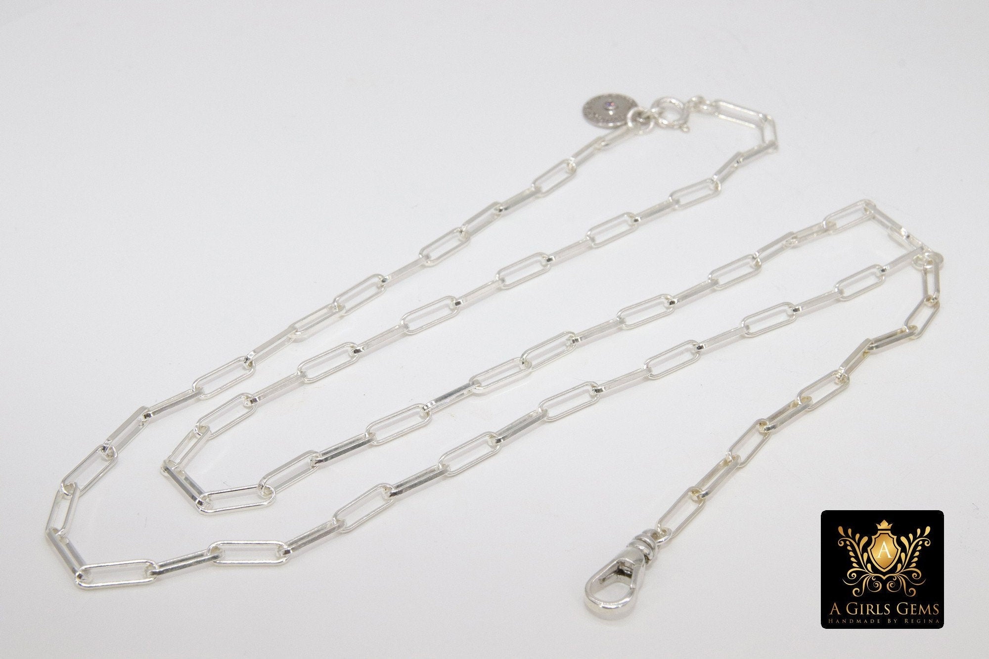 This necklace is as seen in Picture #1 on our Largest 925 Sterling Silver Designer Rectangle Chains, ***NOT plated *** will last a lifetime. Includes a 925 Fob Swivel Clasp in the front to add on your Pendants and Spring Ring clasp on the back of the necklace. We put a Sterling Silver quality tag on the back instead of the plated round tag. This is a larger link chain and thicker gauge then typically seen in this style chain. This gives a bigger look to your necklace. Our most popular lengths are below. If you need a different length, please message us with any questions.