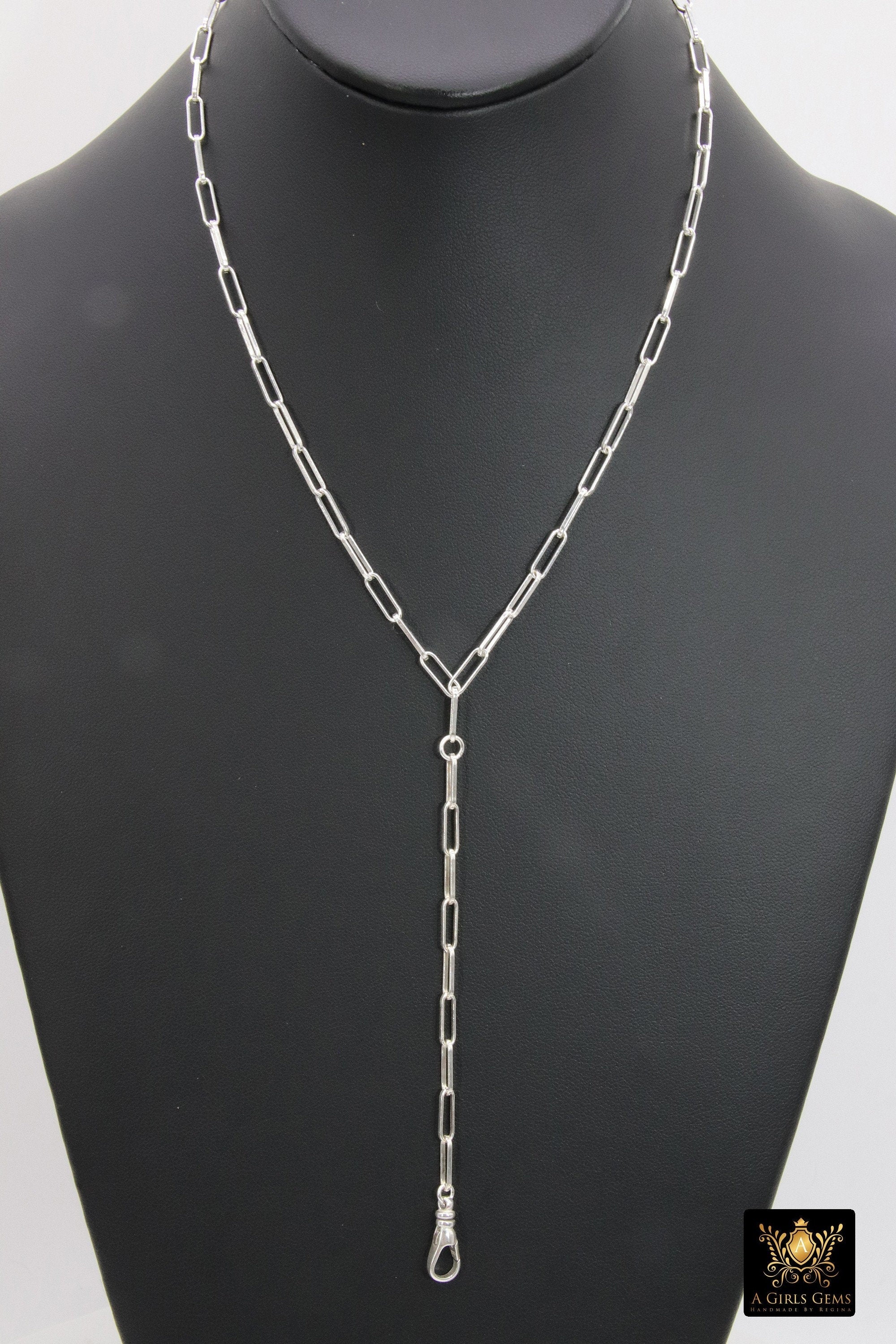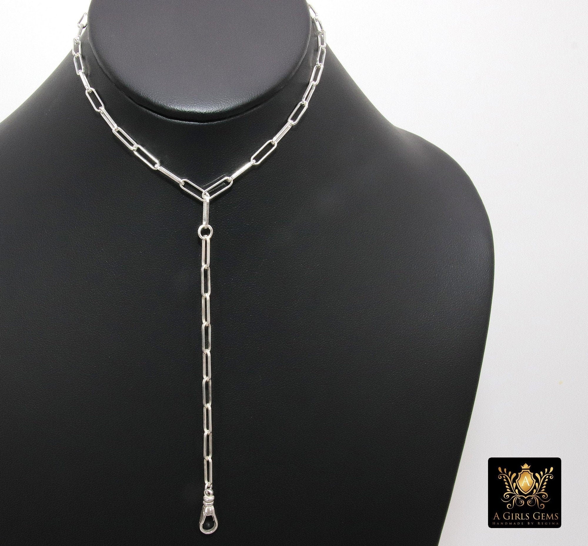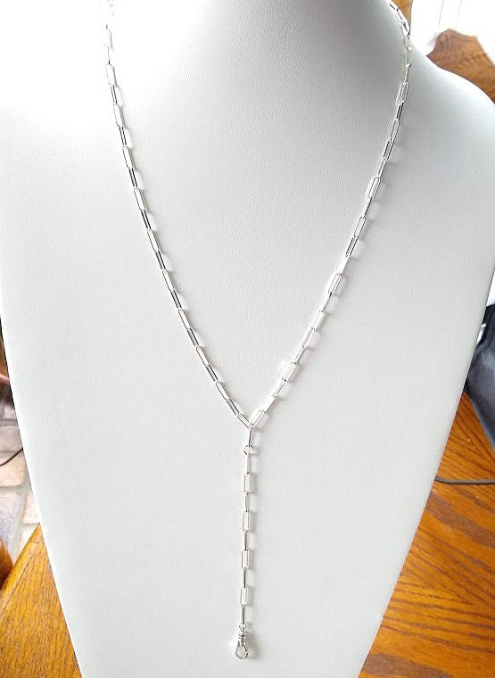 925 Sterling Silver Fob Lariat Necklace, Silver Drawn Rectangle Chain, Front Swivel Clasp Choker