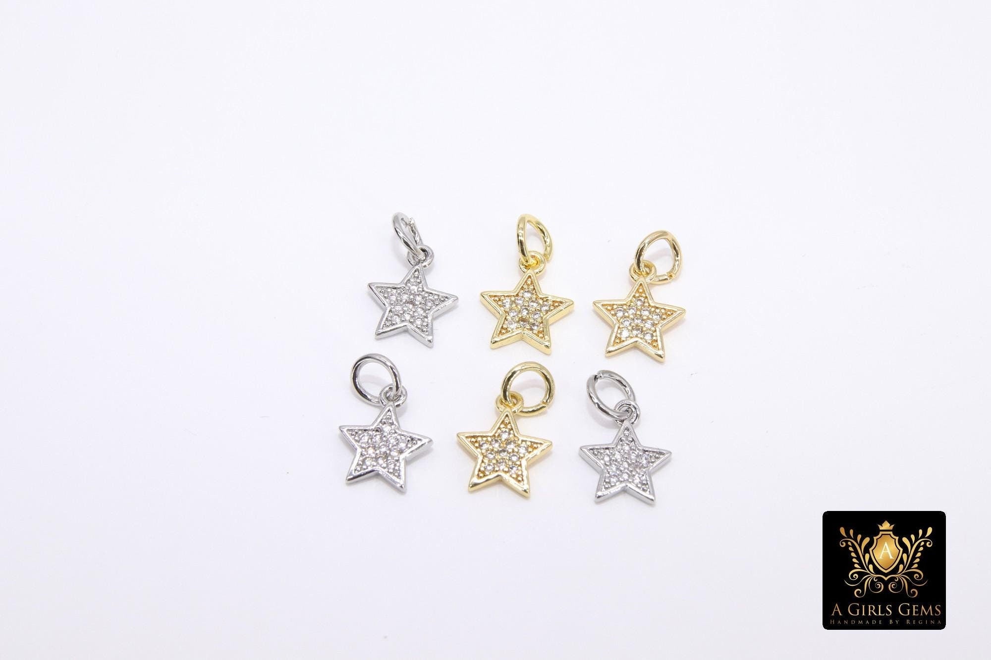 CZ Micro Pave Gold Star Charms, Silver Mini Star Dangles #14, Cubic Zirconia Small Mini Stars