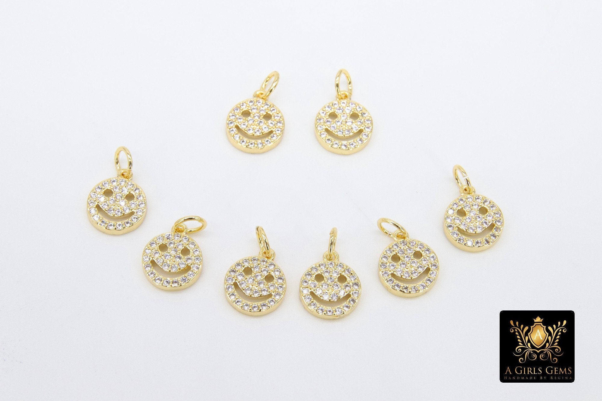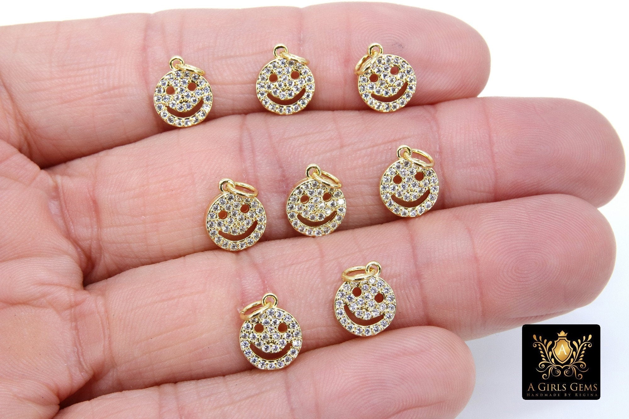 CZ Micro Pave Smiley Face Charms, Gold Cubic Zirconia Happy Face For Bracelet #553, Tiny Necklace Charms 9 x 10 mm