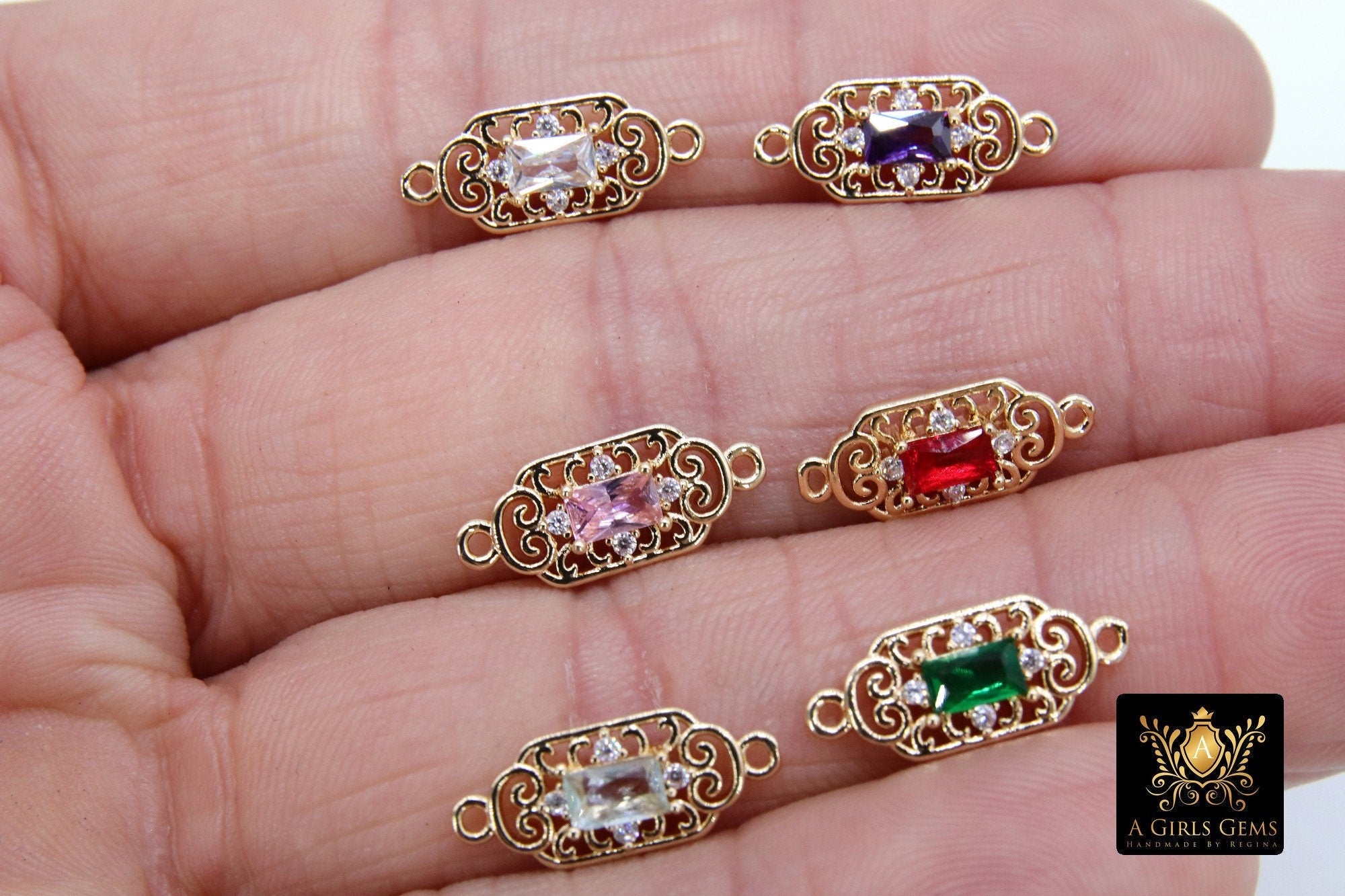 Gold Filigree Crystal Connectors, CZ Rectangle Shape Color Filigree Links #78, Red Pink Blue Mint Green Purple 7 x 17 mm