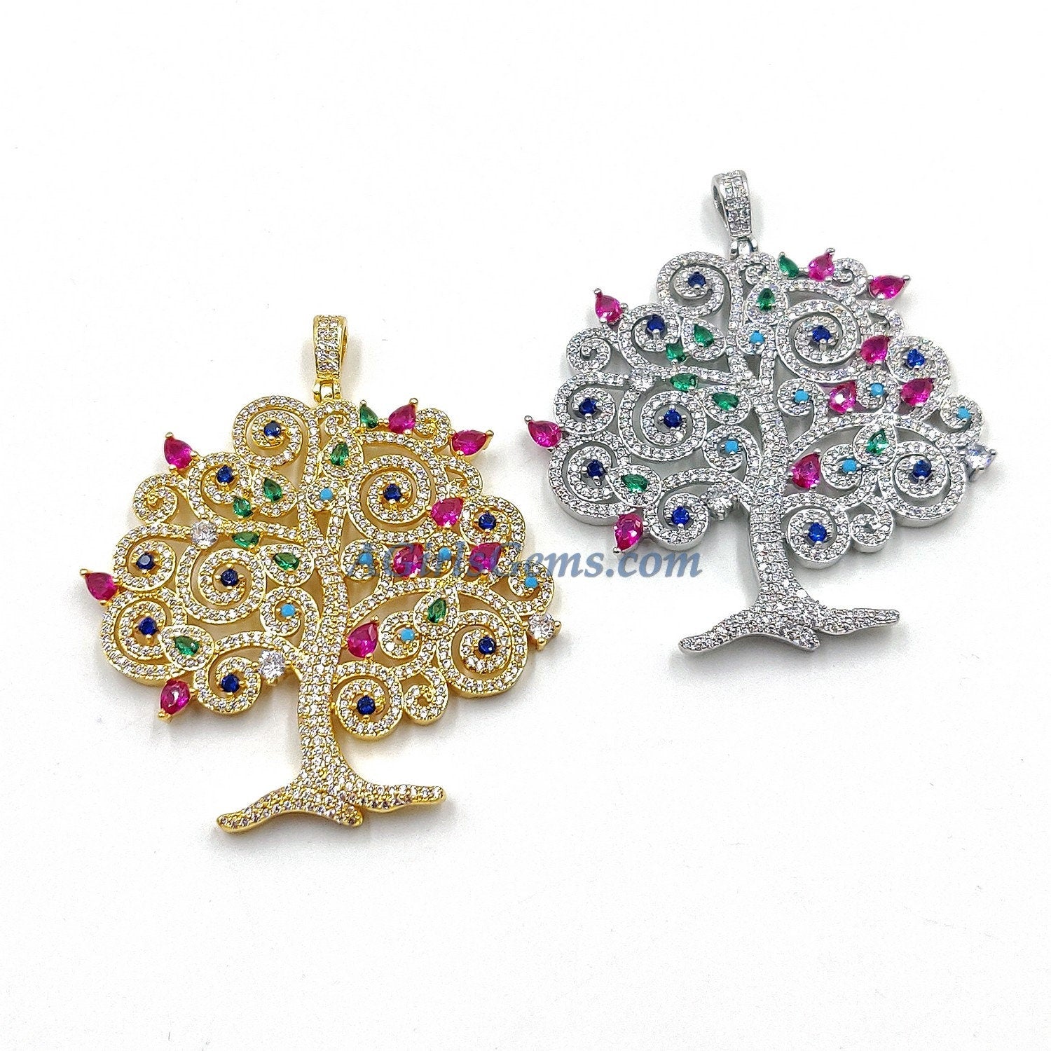 Large Tree of Life Pendant in Pink Sapphire, Emerald Green, Blue Turquoise, Sapphire blues Cubic Zirconia.