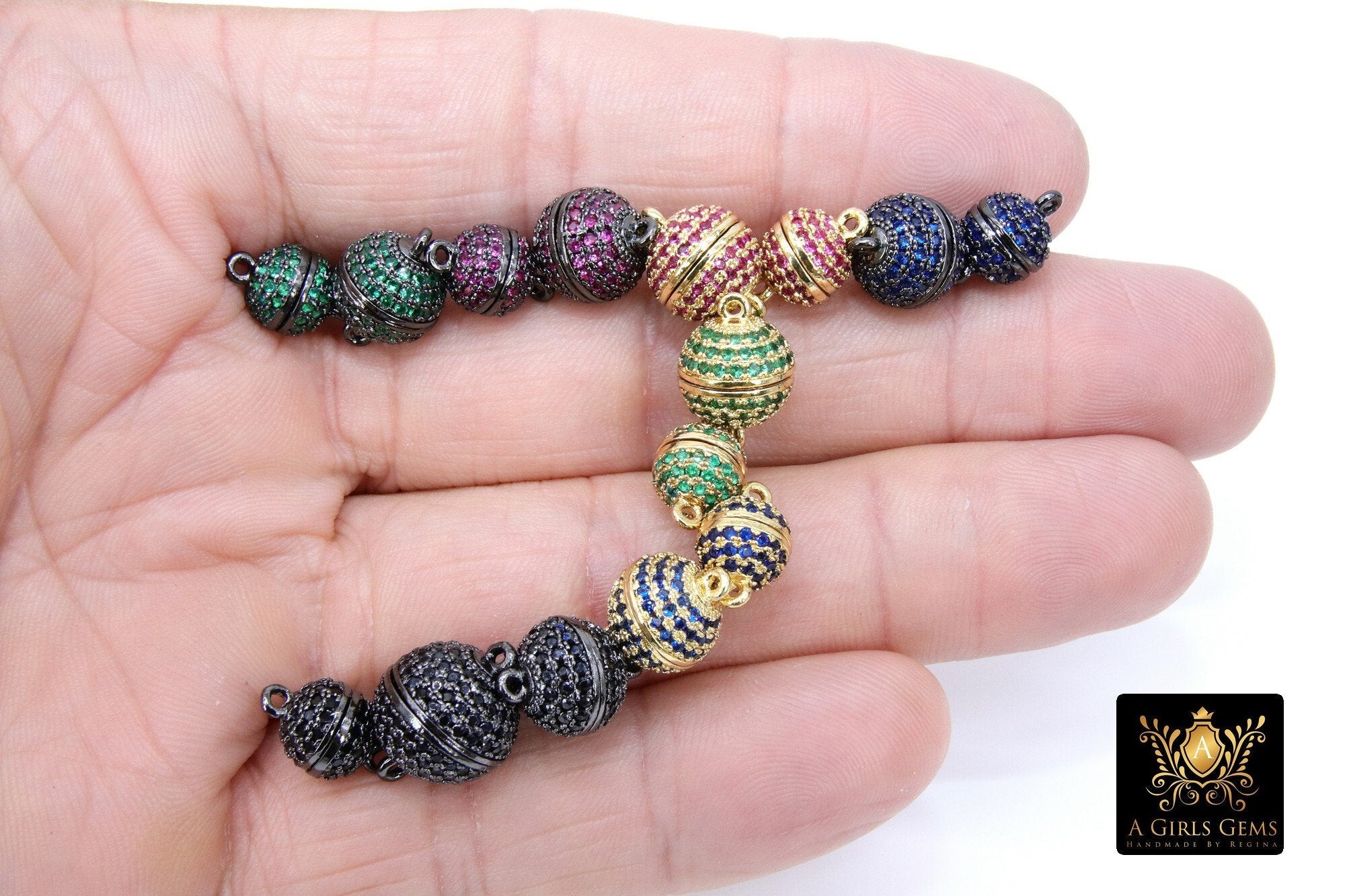 CZ Round Gold Pave Magnetic Clasp, Black Pave Super Strong Micro Pave Clear Cubic Zirconia Bracelet Clasp, Bail Clasp, High Quality Jewelry Findings. Comes in Red Fuchsia, Blue Sapphire, Emerald Green or Black Cubic Zirconia.