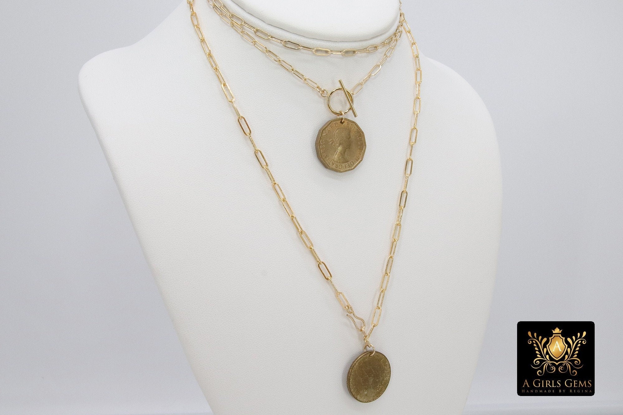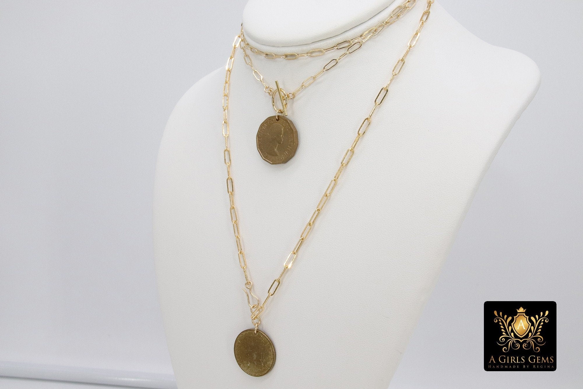 This 34 Inch necklace is on our 14 K Gold Filled #2 Pictured Designer Rectangle Drawn Chains, ***NOT plated *** will last a lifetime. Includes a 14 K Gold Filled Toggle. Choose your World Coin Selection. Our most popular lengths are below. If you need a different length, please message us with any questions.