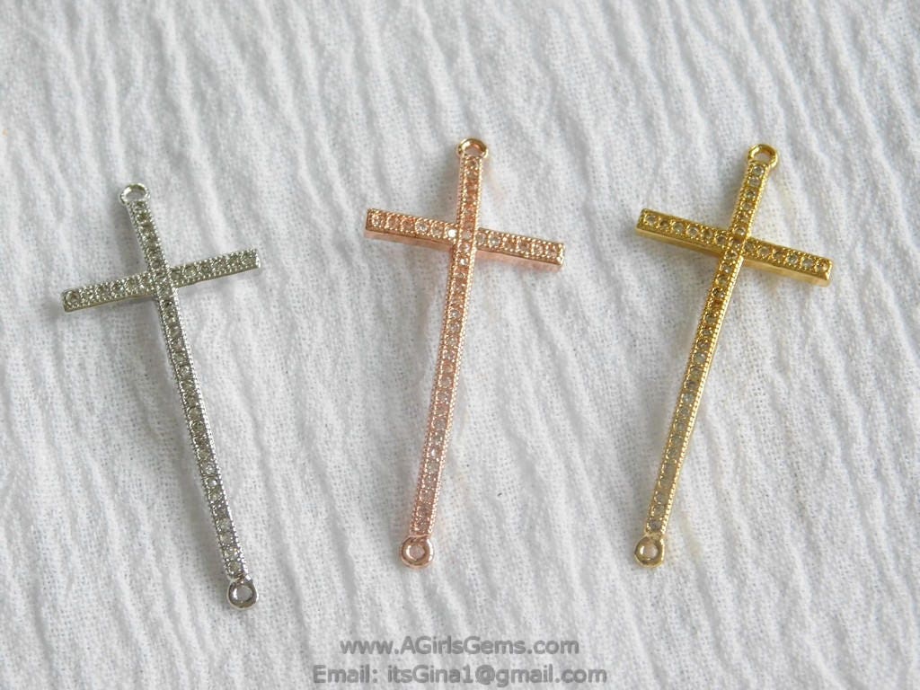 CZ Cross Connectors, Micro Pave Bracelet Cross Connector Beads, 16 x 33 mm, Cubic Zirconia Gold, Rose, Silver Plated.